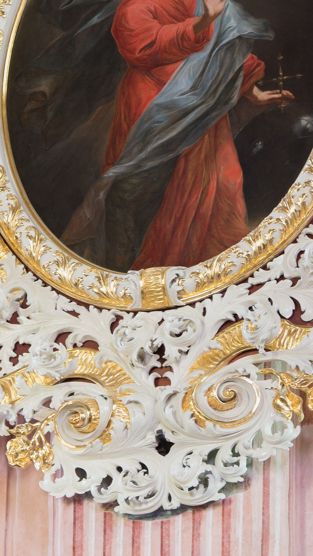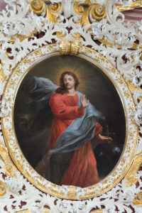 Popis. Oválný obraz obsahuje vyobrazení žehnajícího Krista, vyobrazeného jako Salvator Mundi – Spasitel světa, což bylo zdůrazněno zobrazením zeměkoule. Kristus na tmavě hnědém pozadí, osvětlený především kolem hlavy díky pravidelně rozmístěným paprskům. Pozadí navíc zpestřuje šedomodrý kabát splývající za postavou. Stojící Ježíš zobrazený ve více než 3/4 výšky postavy (nejsou mu vidět jen chodidla a kotníky), heraldicky otočený zanedbatelně doleva, pod rouchem je patrné levé koleno mírně pokrčené. Hlava směřuje téměř rovně, mírně odvrácená od zbytku těla, obličej s velmi jemnými, ale zřetelně mužskými rysy, s velmi krátkým, řídkým plnovousem a dlouhými vlasy, spadajícími do kadeří přes pravé rameno a na druhé straně do zad. Pleť obličeje je na tvářích lehce růžová, s tmavýma očima, strništěm a světlými kaštanovými vlasy. Kristova pravá paže je ohnutá v lokti a žehnající ruka je viditelná vlevo (heraldicky) od osy obrazového pole, proti levému rameni postavy. Vlevo spuštěno dolů, na stranu – Ježíšova ruka objímá kříž korunující sféru světa. Salwator oblečený v dlouhém jednoduchém červeném hábitu s dlouhými, dosti širokými rukávy a šedomodrým, bohatě řaseným kabátem přehozeným přes levé rameno, vpředu šikmo dolů z levé strany postavy doprava, vzadu splývající . Částečně na pravé (z pohledu diváka) straně obrazového pole dole je vidět velká koule, šedá s bělavými odlesky světla na konvexním povrchu, zakončená hnědým (implicitně zlatým) křížem s jemnými koncovkami na koncích ruce. Částečně prolamovaný rám. V obecném obrysu oválu, mírně protáhlý na svislé ose. Nahoře je výzdoba rámu o něco propracovanější, má charakter finály, na jejíž ose je nahoře roh se svazkem lilií a růží (znovu vytvořených při konzervaci) . Rám je zespodu vyříznut rovně. Vyrobeno ze symetrických, vícevrstvých vazeb akantového bičíku v bílé barvě leštěného podkladu, s ostrým stylingem (zatím však nevadnoucí) a zlatými růžemi. Popisované vazby jsou obohaceny o motivy zcela nebo částečně zlaté: profilované proužky, různě široké úseky nabírané stuhy, většinou točené (s volutovým zakončením) a rohy sloužící jako květinové vázy.