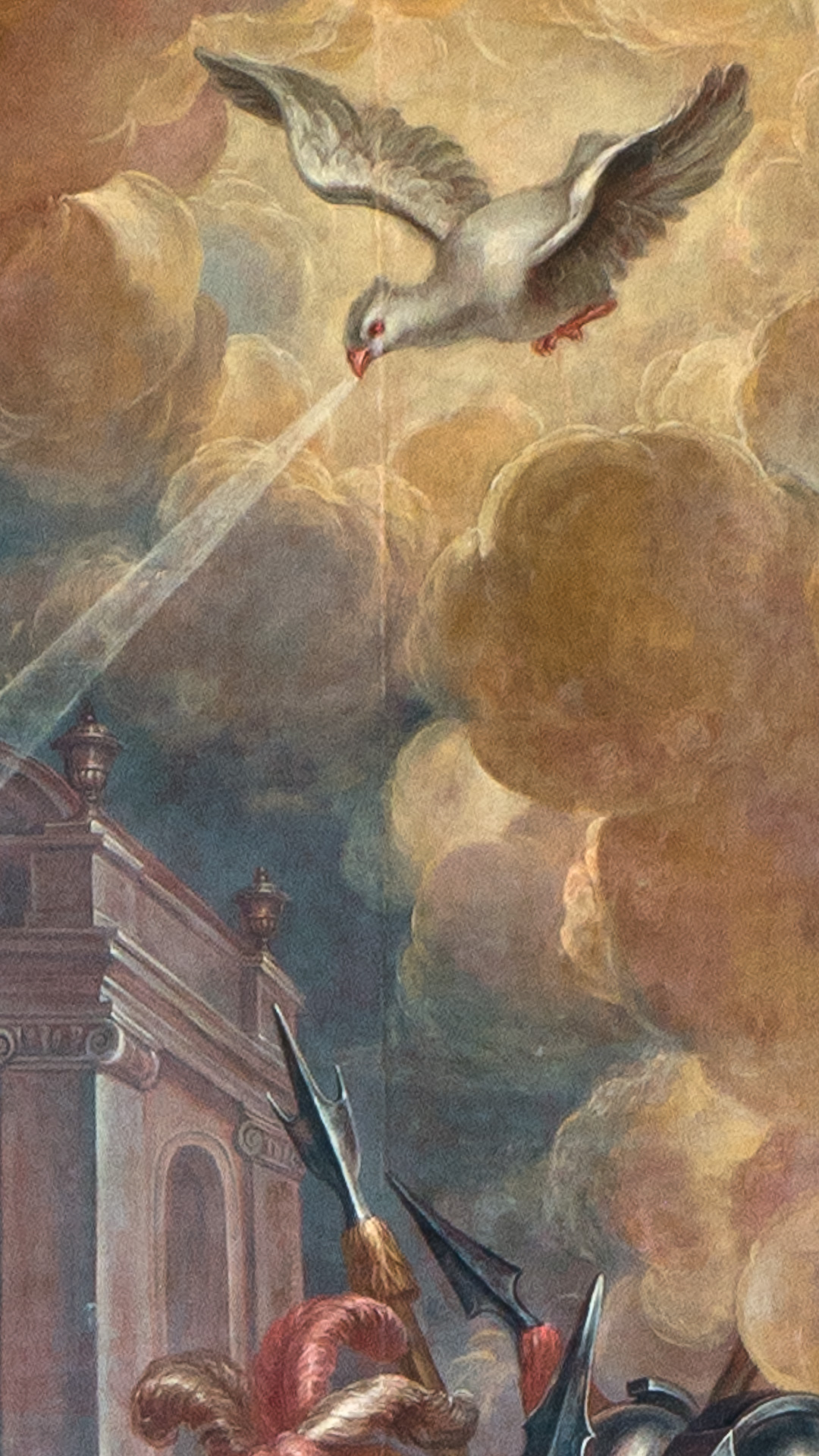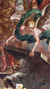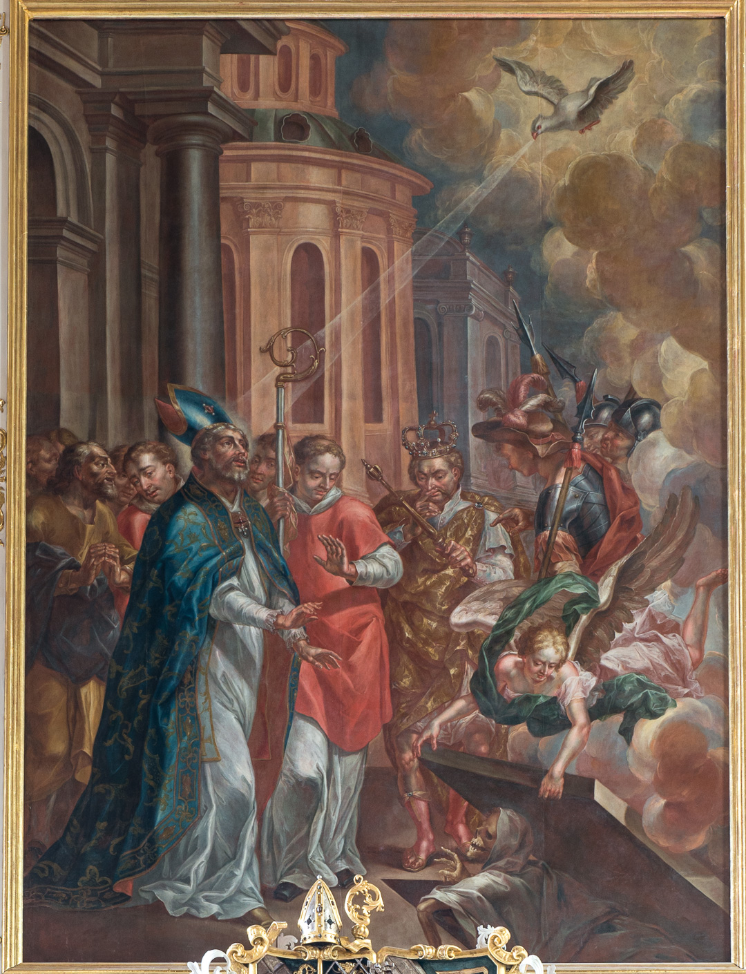 Popis: Obraz malovaný na plátně ve formě svisle umístěného obdélníku. Kompozice zachycuje sv. Stanislava, krakovského biskupa, jak koná svůj nejvýznamnější a nejslavnější zázrak: vzkříšení rytíře Petra (Peterowina) za přítomnosti krále Boleslava Smělého. Vícefigurová scéna se zástupem postav a složitou kompozicí. Celek se odehrává tak, jak říká život světce na hřbitově před kostelem v Peterawinu na Visle, podaný zcela fantasticky, i když v souladu se stylovými rysy pozdně barokní architektury. Architektonické motivy, které tvoří vizi tohoto kostela, zaujímají postupné plány na levé (z pohledu diváka) strany obrazu směřující k jeho ose. Vícefigurální zobrazení zabírá celé popředí, o něco užší, pravou (z pohledu diváka) část pole zaplňují mraky a z nich jakoby vystupují postavy králových vojáků a také nadpřirozené motivy a postavy. Levou část obrazu (z pohledu diváka) vyplňuje družina sv. Stanislava shromážděná před vchodem do kostela. Fasáda tohoto chrámu, prezentovaná v perspektivě, se nachází za zadní částí této skupiny: je zde vidět šedomodrá, monumentálně pojatá zeď obohacená o sloupy (jeden je vidět) a do této zdi zasazený půlkruhový portál. Ve výše uvedené skupině postav je svatý Stanislav umístěn nejblíže k divákovi, otočený do 3/4 k ose obrazu, a je zobrazen v plné podobě, stojí v kontrapostu (s pravou nohou pokrčenou v koleni a chodidlo natažené dopředu, částečně je vidět světcova žlutohnědá bota, vyčnívající pod oděv). Hlava je mírně zvednutá; tvář staršího muže rámuje šedé strniště s krátkým plnovousem; vlasy podobné barvy rámují čelo, spánky a zadní část biskupovy hlavy. Oči světce vztyčené k holubici Ducha svatého jsou vyobrazeny v pravém (na straně diváka) horním rohu obrazu; tvář jakoby ponořená do jakési extáze. Světec má obě ruce šikmo dolů a dopředu, rukama dělá jemná gesta – jako by předával přijatou sílu – zaměřená na tu část zobrazení, která je viditelná na opačné straně obrazu. Stanislav oděný v biskupském oděvu: bílá alba, amice téže barvy, nahoře modrá kopa se zlatými ornamenty a dole tmavě růžová, na hrudi připevněná; kříž visící na sponě. Z pod vršku se také vynoří štola. Na hlavě světce je mitra v barvách podobných kapa, s drahokamem na ose. Za postavou biskupa je vidět skupina tvořící jeho pomocníka. Nejviditelnější tři postavy jsou v přední části skupiny: dva jáhni (jeden stojí za světcem) s mladými tvářemi a tmavě plavými vlasy, oděni do bílých alb a červených dalmatik, a šedovlasý stařec s dlouhým plnovousem, s rukama sepjatýma k modlitbě, oděni do světských nadčasových hábitů ve žluté a modré barvě (starý muž je vyobrazen hned vedle levého – z pohledu diváka – okraje obrazu). Jáhen, viditelný v plné podobě, vlevo (heraldicky) od biskupa, zobrazený v dosti živé póze vyjadřující překvapení při pohledu na Peterowina vynořujícího se z hrobu, drží v rukou berlu. Za touto trojčlennou skupinou je v zadní části skupiny za svatým Stanislavem vidět pět hlav postav – ty, které jsou viditelné jako celek, mají individualizované a poměrně detailní rysy. Když půjdete dále k ose obrazu, můžete vidět postavu krále Boleslava Smělého stojící před divákem, zobrazenou o něco více v hloubce kompozice než výše zmínění lidé. Postavení panovníkova těla je maskováno róbami a nohy jsou uspořádány do mírného kontraposta s pravou nohou vpřed a kolenem pokrčeným na stejnou stranu. Vládce zvedá pravou ruku k obličeji, zakrývá si nos a chrání se tak před zápachem stoupajícím z Peterowinova hrobu; v levé natažené ruce drží šikmo hnědé a zlaté žezlo. Hlava panovníka je nasměrována mírně na pravou (heraldicky) stranu (jako by se odvracel od hrobu) a mírně nakloněna dolů. Král s tváří zralého muže, s blond vlasy viditelnými nad ušima, po stranách obličeje. Je oděn do bílého spodního prádla pestrého střihu a hnědo-zlatého kabátu, sepnutý vlevo barokní, hojně přeložený. Na Bolesławově hlavě je uzavřená, kamerou pokrytá koruna se čtyřmi oblouky a křížem nahoře. V pozadí popsaných obrazců jsou další dvě (za kostelem – může být jeho součástí?) monumentální stavby umístěné v perspektivě podél diagonální linie: nejprve je vidět centrální budova ze světlých cihel a za ní fragment další budovy, šedošedé, na obdélném půdorysu, s vysokými, půlkruhově ukončenými okny. Pravá (z pohledu diváka) část obrazu, která zabírá o něco méně místa, obsahuje několik motivů naskládaných nad sebou. Dole v rohu je jeviště, které je ideovým a narativním centrem představení. V hladké šedé zemi, na které stojí světec, jeho sluha a král, je ve stavu obdélníkový otvor vedoucí ke vchodu do hrobky rytíře Petra. Anděl vznášející se nad tímto otvorem (ležící vodorovně, s mladistvou tváří, blond vlasy, v bílém spodním prádle a zahalený do splývavé zelené draperie) zvedá okraj masivní rovné desky zakrývající hrobku, která je nyní nastavena pod úhlem 45 stupňů. stupně k zemi. Takto vytvořeným východem z hrobu, otevřeným na pravou (heraldicky) stranu, vychází mrtvola Peterowiny, hnědá, s vyceněnými zuby, pokrytá bílým rubášem, zvedající ruku s dlouhými nehty ke světci a králi. Prostor nad andělem a podél pravého okraje obrazu je vyplněn mraky: bílým, žlutým, šedým a růžovým (v odstínech). Z těchto mraků uprostřed obrazu vystupují směrem k jeho ose tři postavy patřící králově asistenci. V popředí je muž, zobrazený z levého profilu, oblečený v červeném hábitu a šedomodrém brnění a zdobeném klobouku, oslovuje krále, prsty má z