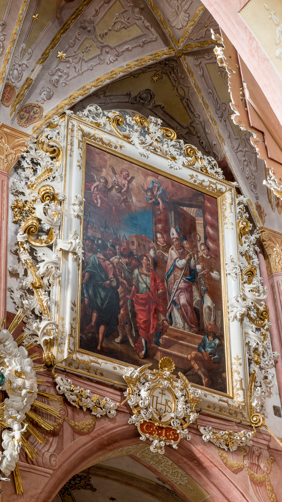 Historie: Obraz patří do série umístěné na stěnách lodi věnované dvěma svatým patronům kostela (a zároveň patronům zemí, ze kterých pocházeli): Stanislavu, krakovskému biskupovi a mučedníkovi, a Václav, český kníže a také mučedník. Celá série vznikla z iniciativy jezuitů, ale pouze tento jeden obraz a jeho rám financovala kolej ve Świdnici. Možná jezuité objednali obraz na vlastní náklady, aby šli příkladem pro případné sponzory. Pokud tomu tak bylo, lze předpokládat, že obraz vznikl poměrně brzy, možná ještě před založením Johanna Antona von Schaffgotsche v roce 1711 (obraz sv. Stanislava rozdává almužny). To je však pouze hypotéza.