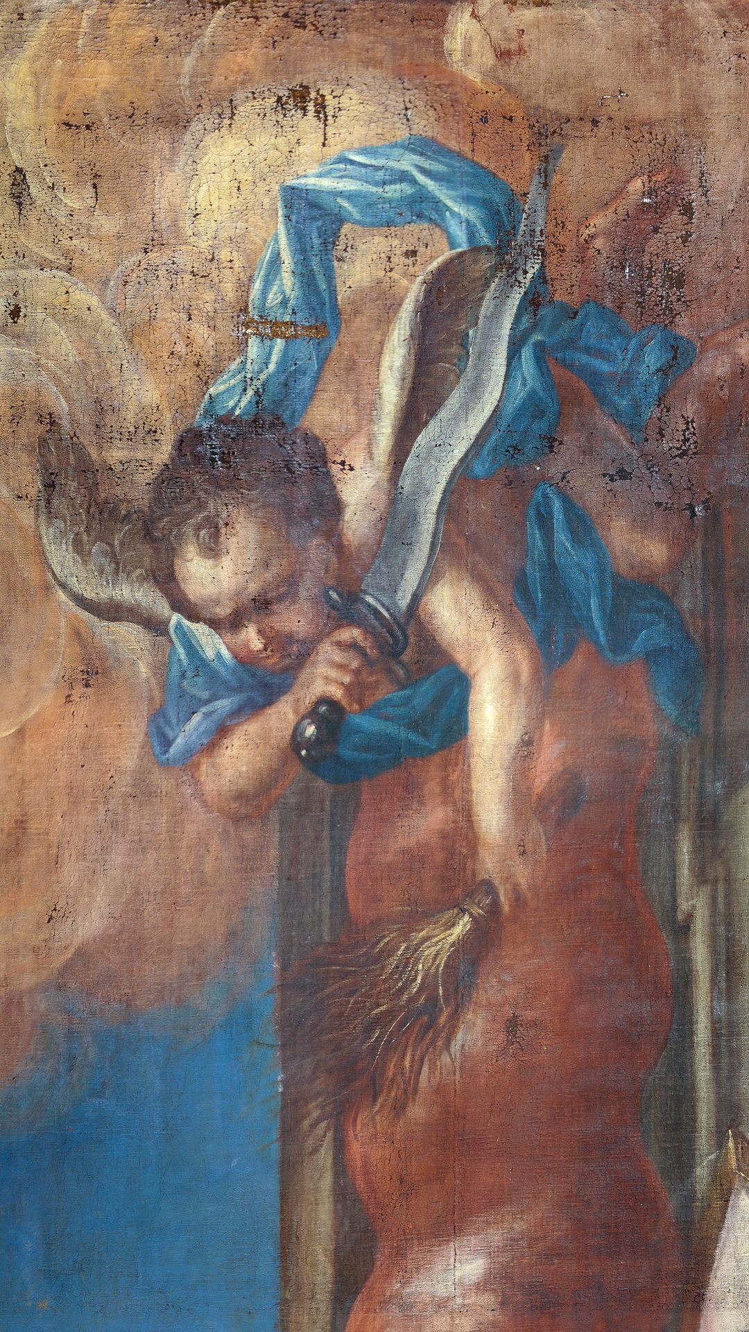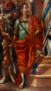 Popis: Obraz malovaný na plátně ve formě svisle umístěného obdélníku. Kompozice zobrazuje sv. Stanislava, krakovského biskupa, který proklel krále Boleslava Smělého. Vícefigurová scéna se zástupem postav a složitou kompozicí. Celé se to odehrává na pozadí hnědé (v odstínech) a šedé architektury – před vchodem do kostela; vlevo od diváka) nahoře, mírně vpravo (heraldicky) od osy obrazu, je mýtina s oblohou a mraky. V dolní části popředí je zobrazena hnědozem. Po pravé straně kompozičního pole (od diváka) je vstup do kostela situovaný na vyvýšené plošině, kterému předcházejí tři schody. Obdélný portál, pootevřené dveře, za nimi je vidět interiér chrámu s architektonickými prvky. Portál lemují dva kudrnaté sloupy, horní část fasády je zakryta mraky a odříznuta hranou malby. Na plošině před vchodem do kostela je vidět ze stran a zezadu skupina sestávající ze sv. Stanislava a tří duchovních, kteří ho obklopují. Světec je zobrazen v celém těle v animovaném pohybu; je otočen do 3/4 k ose obrazu, jeho silueta je zkroucená do tvaru písmene „S“ a boky jsou mírně protaženy k pravé (heraldické) straně. Hlava světce je mírně nakloněna dolů, tvář s rysy staršího muže orámovaná strništěm se středně dlouhým plnovousem; strniště a viditelné úlomky vlasů hnědé. Stanislav s rukama zdviženým vzhůru, patrný na levé (heraldicky) straně, ve výšce krku, drží horní část diagonálně posazené berly a je oděn v biskupském oděvu (bílá alba, ornát s hnědý vzor látky a zespodu modrý přebal, růžový a fialový vršek, pod krkem zapínaná spona s drahokamem, u krku viditelný lem bílé amice a na hlavě bílá mitra, zespodu modrá, s drahokam na ose); roucho světce se souhrnně upravenými záhyby plnými pohybu. Duchovní stojící vedle světce v plné formě (jeden částečně viditelný vzadu), velmi živým pohybem, drží v rukou různé předměty (jáhnové po stranách drží: vlevo – od diváka – otevřenou knihu, kterou světec se pravděpodobně dívá, vpravo – klíč; druhý klíč drží kněz stojící za světcem). Dva jáhnové po stranách nosí pod krkem bílé alby, amiky a červenohnědé dalmatiky (u jednoho z nich nejblíže k pravému okraji obrazu – z pohledu diváka – jsou vidět modré stuhy z jednoho strany dalmatiky). Duchovní stojící za světcem má na sobě špatně viditelný kanovník a na hlavě černý biret. Protiváhou skupině ze St. Stanislava je skupina vojáků doprovázejících krále, zabírající levou (z pohledu diváka) polovinu obrazu. Nejvýznamnější postavou je zde panovník, stojící blízko světce, u paty schodiště, zobrazený v plné podobě, čelem k divákovi, ale s hlavou otočenou o 3/4 na levou (heraldickou) stranu. Jeho tvář s velmi výrazným, až brutálním výrazem, s „huňatým“ knírem je podobná sarmatskému typu známému mj. z portrétů Jana III. Sobieského a jeho současníků, i když je samozřejmě výrazně „přehnaná“ ); vlasy a strniště postavy jsou hnědé. Vládce položí levou nohu na první stupeň schodiště a ruku na stejné straně podepře bokem. Ve sklopené pravé ruce drží bronzové žezlo. Má na sobě spodní prádlo, starožitnou šedomodrou polozbroj (nebo pokrývku trupu z měkkého materiálu, např. barvená kůže, pokrývající tělo), červený kabát s monumentalizovanými záhyby a modré boty zakrývající lýtka. Vojáci, kteří ho doprovázejí, stojící v animovaných pózách ve skupině za ním, jsou čelem ke králi, i když mají hlavy otočené různými směry. Jeden z nich, zády k divákovi, je zobrazen v popředí, nejblíže k divákovi a dívá se na tuto skupinu. Vojáci drží tyčové zbraně viditelné nad jejich hlavami. Jsou oděni do převážně nadčasových šatů s drobnými prvky odkazujícími na orientální módu (např. kožešinová čepice na hlavě vojáka zobrazeného nejblíže králi); barvy jsou vidět zde. bílá, zelená a růžová a odstíny hnědé a šedé. V pravém (na straně diváka) rohu obrazu žebrák v roztrhaných šatech (hnědé kalhoty, modrý kaftan a hnědá čepice), sedící na kameni a hledící na krále s holí. Ekvivalentem této postavy ve druhém dolním rohu je kámen ležící na zemi, o který se nejblíže k divákovi opírá noha vojáka zobrazeného zezadu. V dalekém pozadí, v pozadí hlavní scény, jsou dole vyobrazeny hnědé budovy, nad kterými je vidět modrá obloha s bílými mraky. Při horním okraji, v bližší rovině obrazu, jsou patrné bílo-šedé a růžové mraky a na jejich pozadí jsou postavy tří létajících andělů pokrytých barevnými závěsy. Jeden z nich, nejblíže k levému (od diváka) okraji obrazu, drží rozbitou svíčku, ostatní jdou doleva (heraldickým způsobem): prostřední má červenou a poslední drží ve své tyči. levou ruku a plamenný meč v pravé ruce.