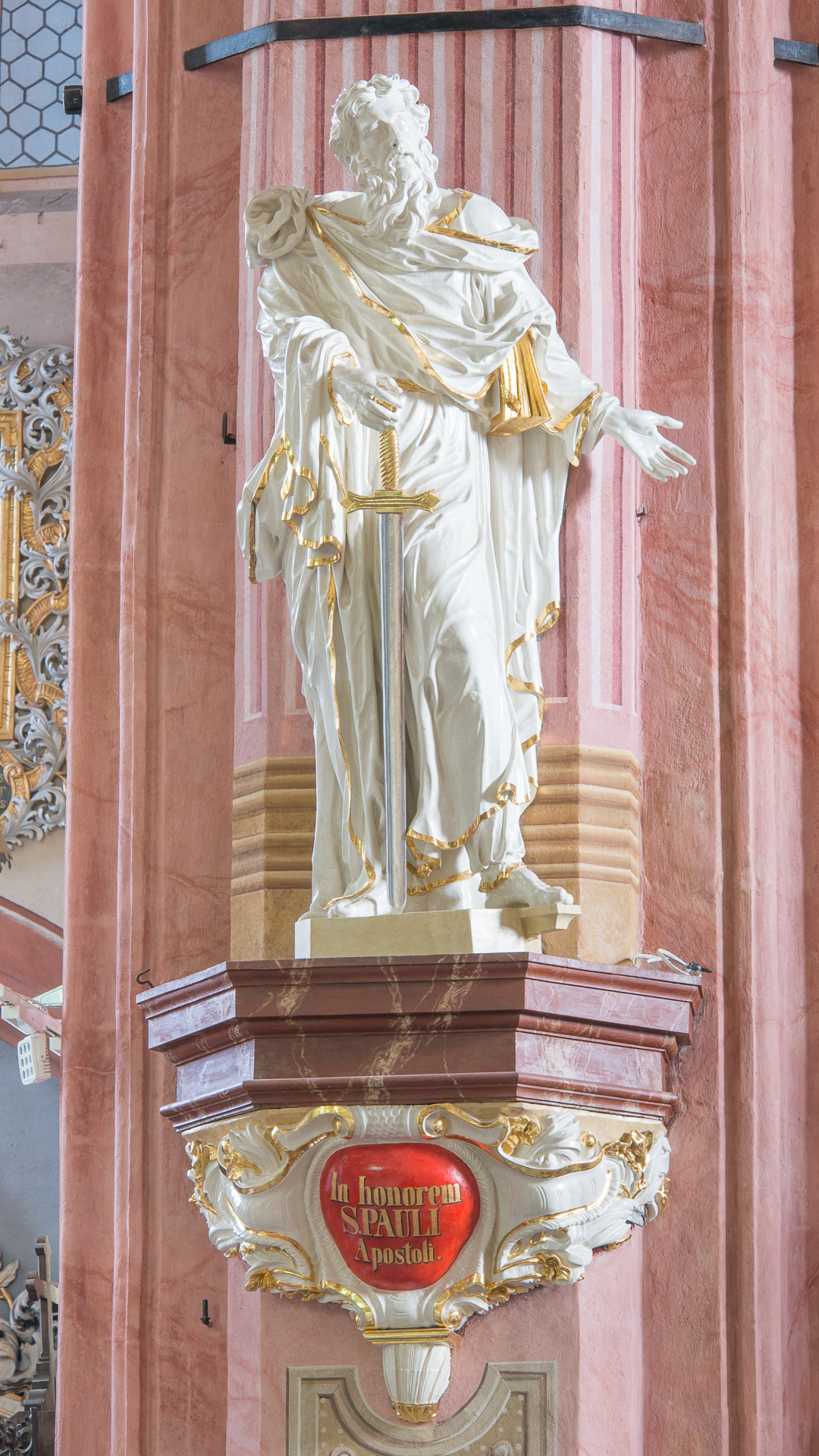 Beschreibung: Eine ganzfigurige, fast volle, zurückgeschnittene und hohle Darstellung eines stehenden Heiligen Paulusus, der auf einer an einer Säule aufgehängten Konsole sitzt. Eine markante Konsole, von vorne verziert mit einer massiven Volutenkartusche, der von unten vorangegangen ist eine Art hängende gerillte „Muschel“. Seitliche Kartusche mit Blättern verziert; in der Mitte eine ovale Tafel mit goldener Inschrift auf rotem Grund: „In honorem | S. PAULI | Apostel.“ Über der Kartusche die Oberteil der Konsole, vieleckig, profiliert in Form eines Gesimses, bedeckt mit brauner Marmorierung. Auf der Oberseite der Konsole befindet sich ein zusätzlicher Sockel für die Figur in Form einer dicken Platte.