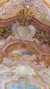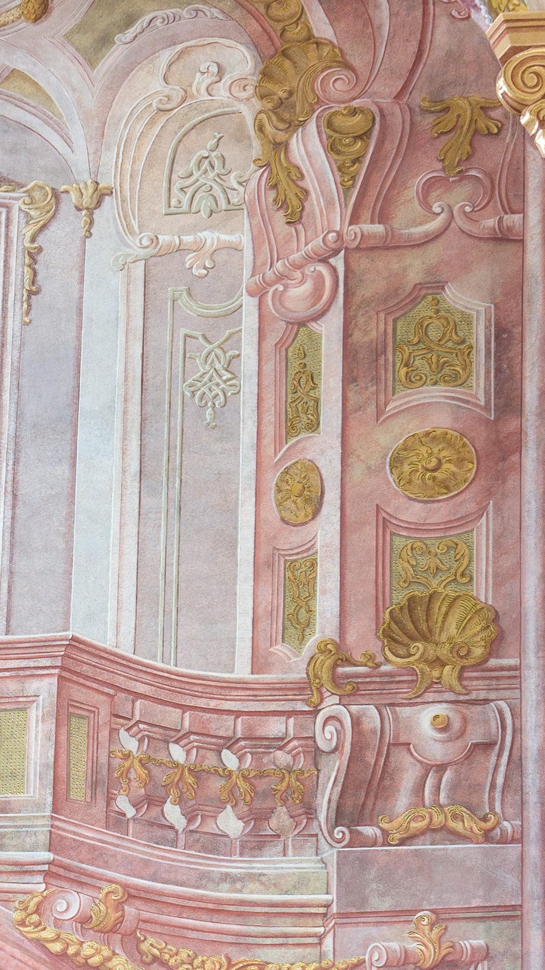 Opis: Kompozycja wypełnia powierzchnię ściany bocznej przęsła nawy głównej, wliczając w to dekorację przyłuczy ostrołukowej arkady międzynawowej widocznej u dołu ściany oraz profile tej arkady. Profile pokryte są barwą identyczną z tą, która dominuje w dekoracji ściany powyżej, w jej ciemniejszym odcieniu, z bardzo nieznacznym motywem „marmoryzacji”. Ściana zamknięta jest od góry łukiem ostrym. Dalej jej powierzchnia określana jest w opisie również jako pole: w przypadku gdy w opisie nie zaznaczono o jakie pole lub o jaką powierzchnię chodzi zawsze dotyczy to bocznej ściany przęsła. Wszystkie elementy architektoniczne i ornamentalne służące do dekoracji pola są iluzjonistycznie malowane (w dalszej partii opisu dekoracja ta traktowana jest jako zbiór rzeczywiście istniejących plastycznych motywów, niekiedy bez zaznaczania, że chodzi o przedstawienia iluzjonistyczne, oddane w warstwie malarskiej na płaskiej powierzchni tynku). Realnie istniejącymi elementami architektonicznymi są jedynie widoczne po bokach pola, ścięte na bocznych krawędziach pilastry z uproszczonymi, płaskimi głowicami. Motywy dekoracyjne na powierzchni trzonów i głowic tych pilastrów są iluzjonistycznie malowane – dotyczy to motywów kanelowania na trzonach i dekoracji ornamentalnej kompozytowych kapiteli. Dołem pilastry wspierają się na podstawach figur umieszczonych na ścianie nawy. Opisane pilastry oddzielają pole od sąsiednich, których dekoracja, bardzo ograniczona (obejmująca jedynie przyłucza arkad i szczyty pól) rozwiązana jest odmiennie ze względu na zawieszenie na ścianach tych sąsiednich przęseł wielkich, prostokątnych obrazów w bogatych ramach. Obrazy o wielkich formatach zawieszone są na bocznych ścianach trzech przęseł nawy głównej (łącznie więc na sześciu ścianach) – chodzi o przęsła pierwsze, trzecie i piąte idąc od wschodu. Natomiast dekoracja podobna do opisywanej poniżej wypełnia boczne pola dwóch przęseł nawy głównej (łącznie obejmuje więc cztery ściany) – chodzi o przęsła drugie (jego północna ściana jest opisana w prezentowanej nocie) i czwarte idąc od wschodu. Dekoracja ścian bocznych ostatniego, szóstego idąc od wschodu, węższego od wszystkich pozostałych, przylegającego do chóru zachodniego przęsła nawy głównej, ma jeszcze inny charakter (dekoracja ta opisana jest w odrębnej nocie). W części górnej pionowo wznosząca się, płaska powierzchnia opisywanej tu ściany łagodnie przechodzi w trójkątne w rzucie, sferycznie wygięte ku górze pole sklepienia (zwane kozubą – tu określane mianem „lunety”). Dekoracja malarska lunety – poza motywami widocznymi na granicy ze ścianą poniżej – nie została tu uwzględniona, gdyż przynależy do partii sklepienia. Ściany lunety od strony zewnętrznej obramowane są żebrami dzielącymi widoczne wyżej sklepienie na mniejsze pola. Żebra te wspierają się na wewnętrznej krawędzi głowic pilastrów oddzielających opisywane pole od pól sąsiednich przęseł. Powierzchnia ściany przęsła pokryta jest malowaną iluzjonistycznie dekoracją architektoniczną (dominującą) oraz figuralną i ornamentalną. Dekoracja ta imituje wygląd balkonu-empory znajdującej się jakby ponad nawą boczną świątyni. Emporę od tyłu zamyka mur, w licu którego umieszczone jest okno (raczej niewielkich rozmiarów w stosunku do całej powierzchni ściany). Elementy architektoniczne flankujące okno wyżej przechodzą w strukturę coraz mniej konsekwentną jeśli chodzi o wzajemne powiązanie motywów (te ostatnie w realnej architekturze zgodne z logiką tradycyjnych połączeń między częściami architektury i detalami – tu najczęściej fantastyczne). Struktura ta ma w ogólnych zarysach formę trójlistnego łuku, ponad którym na osi znajduje się okazały kartusz. Powyżej niego dostrzec można gzyms ścianki zamykającego całość zwieńczenia, jednak gzyms ten przynależny już do tej części malowanej dekoracji, którą rozmieszczona jest na powierzchni lunety. „Konstrukcja” tak opisanej wielkiej, trójlistnej arkady wspiera się na dwóch widocznych po bokach prostopadłościennych filarach, które na dole zaczynają się w połowie wysokości łuku realnie istniejącej arkady międzynawowej. Do tych filarów powyżej tej arkady „dostawiona” jest balustrada balkonu, a na jej wysokości boczne filary przerwane są przez masywne, odwrócone, wolutowe konsole. Tralkowa balustrada złożona jest z trzech odcinków. Środkowy jest szerszy od bocznych i wygięty ku przodowi, boczne natomiast cofnięte są ku tyłowi na linii płytkich łuków odcinkowych; wyszczególnione trzy segmenty rozdzielają dwa filarki. Na wysokości balkonu widoczne są za balustradą dwa prostokątne, wysmukłe boczne przejścia prowadzące na lewo i prawo do dalszych części empory. Półkoliste arkady tych przejść od zewnątrz (od strony nawy głównej kościoła) wsparte zostały na opisanych wyżej filarach, w głębi natomiast na filarach wtopionych w grubość ściany mieszczącej okno. Sklepienie ponad emporą żaglaste. Na jego powierzchni przedstawione niebo z obłokami i unoszącymi się w górę aniołami (widoczne tylko ich nogi i część szat). Okno poniżej prostokątne, w pionie nieznacznie wydłużone, dwudzielne, sześciokwaterowe, przeszklone, zamknięte łukiem trójlistnym, z obramieniem na osi górą wzbogaconym kartuszem. Drugi większy kartusz umieszczony powyżej wielkiego łuku zamykającego od góry całą opisaną wyżej kompozycję, z boków flankowany jest przez dwa aniołki wsparte na obłokach. Wszystkie wyszczególnione elementy i detale architektoniczne ukształtowane w sposób urozmaicony i uzupełnione wyjątkowo bogatą dekoracją ornamentalną. Widoczne: profilowane gzymsy często przerwane na osiach i kończące się wolutowymi zawinięciami, różne innego typu samodzielne woluty, formy wolutowe 
