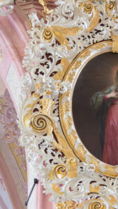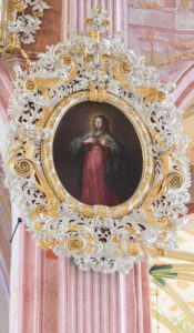 Owalny obraz ukazuje Matkę Boską wyobrażoną w sposób nawiązujący do postaci Marii ze sceny Zwiastowania. Postać na obrazie cechuje spokój i skupienie: Matka Boska przyjmuje swoją rolę w dziele Zbawienia z pokorą: stojąc z opuszczonymi w dół oczami, z prawą ręką złożoną na piersi i lewą przedstawioną w geście wzbraniania się. Rama, bardzo bogata, częściowo ażurowa, w białym kolorze polerowanego gruntu oraz złoceń, zbudowana jest ze splotów tzw. liści akantu, wzbogacono ją także motywami wstęgi, wolut, rogów obfitości oraz kwiatów lilii i róż. Obraz należy do cyklu, który miał za zadanie zilustrować zasługi jezuitów w dziejach Kościoła Katolickiego przez ukazanie najwybitniejszych przedstawicieli zakonu. Jednak zleceniodawcy uznali za słuszne, aby ukazać jezuickich świętych w kontekście całej historii Zbawienia, dodając przedstawienia Chrystusa (jako Zbawcę Świata) i Matki Boskiej (jako Matki Boga). Wykonawcą tej części cyklu jest wrocławski malarz cechowy Johann Jacob Eybelwieser Młodszy (1667-1744). Są to jedne z jego najwcześniejszych dzieł. Niektóre z nich, przypominające w pewnym stopniu portrety, odznaczają się dynamicznym ujęciem, namalowane są przy tym z dużą starannością i subtelnością.