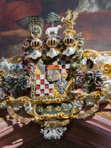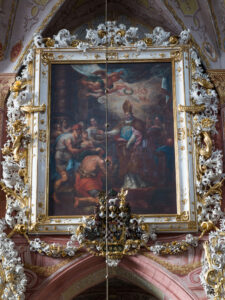 Charakterystyka: Decyzja o wykonaniu dla świdnickiej świątyni wielkich malowideł ilustrujących życie jej patronów była oczywista ze względu na obecny w tym kościele żywy kult liturgiczny wymienionych świętych. Jezuici nie mogąc ze względu na trudności finansowe zlecić wykonania wszystkich niezbędnych dzieł ufundowali – być może dla przykładu – tylko jeden obraz. Wśród pozostałych dwa zlecili duchowni, pozostałe natomiast sfinansowali przedstawiciele śląskiej arystokracji, ale też świdniccy mieszczanie. Johann Anton von Schaffgotsch (1675-1742) był niewątpliwie najpotężniejszym, najbogatszym i najbardziej znanym z fundatorów malowideł z omawianego zespołu. Identyfikuje go nie tylko opisany wyżej szczegółowo herb, ale też napis w poziomym kartuszu poniżej (wszystkie herby i napisy oraz osoby, których dotyczą odczytał, zidentyfikował i opracował badacz przeszłości Świdnicy Sobiesław Nowotny). Napis o którym mowa, składa się z liter „J A G S”, które stanowią skrót imienia, nazwiska i tytułu fundatora („Johann Anton Graf von Schaffgotsch”, czyli „Johann Anton hrabia von Schaffgotsch”). Nieco bardziej skomplikowaną kwestią jest interpretacja złożonego z liter i daty napisu na wstędze poniżej. Została ona jakby podzielona na trzy części. Napis pośrodku, zawierający datę („F. 1711 F.”) z pewnością odnosi się do fundacji dzieła, ale nie mamy pewności czy dotyczy on jedynie samego Schaffgotscha, którego herb znajduje się powyżej (wtedy należałoby go rozwiązać jako: „Fieri 1711 Fecit” czyli „Nakazał w 1711 Wykonać”), czy też napis obejmuje także osoby, których herby znajdują się po bokach (wtedy należałoby go odczytać jako „Fieri 1711 Fecerunt” czyli „Nakazali w 1711 Wykonać”). Niezależnie od tego, która wersja jest słuszna, osoby których herby znalazły się po bokach herbu Schaffgotscha były dla niego tak ważne, że z pewnością chciał je objąć duchowymi pożytkami, jakie płynąć miały z modlitw za fundatorów odprawianych w każdym katolickim kościele. A osobami tymi były jego obie, pochodzące z arystokratycznych rodów żony, które można zidentyfikować dzięki herbom oraz napisom na wstęgach. Na lewej (od patrzącego) części wstęgi znajdują się litery odnoszące się do pierwszej żony hrabiego, Marii Franciszki zmarłej w 1707 roku („M. F. S. G. S.” – „Maria Franziska von Schaffgotsch [geboren] Gräfin von Sereni” czyli „Maria Franziska von Schaffgotsch [urodzona] hrabianka von Sereni”). Natomiast na prawej części wstęgi litery donoszą się do drugiej małżonki głównego fundatora obrazu i ramy, Anny Teresy – była już jego żoną w 1711 roku, w chwili gdy wykonano obraz i ramę („A. T. S. G. K.” – „Anna Theresia von Schaffgotsch [geboren] Gräfin von Kolowrath” czyli „Anna Theresia von Schaffgotsch [urodzona] hrabianka von Kolowrath”, przy czym należy tu zaznaczy, że prawidłowe, pełne nazwisko rodu, z którego wywodziła się druga żona hrabiego von Schaffgotscha brzmiało: Kolowrath-Nowohradsky, ale takie skrócenie nazwiska było dopuszczalne). W ten sposób należy odczytywać ten skomplikowany zespół herbów i inskrypcji. „Obecność” obu żon w tym skomplikowanym rebusie jest zapewne uzasadniona nie tylko szacunkiem czy miłością von Schaffgotscha do swoich towarzyszek życia, ale też chęcią podkreślenia znakomitego ich pochodzenia, które dodatkowo uświetniało rangę rodu ich małżonka. Warto tu odnotować, iż szczególnie druga z żon bardzo zasłużyła się dla przetrwania i ciągłości rodziny swojego męża, urodziła mu bowiem aż czternaścioro dzieci! Ważne wydaje się pytanie kim był fundator tak efektownego dzieła malarstwa oprawionego w jeszcze bardziej wystawną ramę? Ograniczając się tu do podstawowych informacji należy powiedzieć, że ród von Schaffgotsch od dawna należał do jednego z najświetniejszych na Śląsku, a podstawą jego pozycji były ogromne majątki ziemskie, m.in. obejmujące obszar Karkonoszy z przyległościami. Po stłumieniu przez Habsburgów w 1620 roku czeskich dążeń do niepodległości (Śląsk stanowił wówczas część ziem Korony Czeskiej), ród Schaffgotschów utracił znaczną część swoich posiadłości i w 1634 roku został zmuszony do porzucenia religii protestanckiej oraz przejścia na katolicyzm. Śląscy arystokraci pogodzili się jednak z sytuacją – przez następne sto lat wiernie służyli Habsburgom i Kościołowi katolickiemu na Śląsku. Hrabia Johann Anton został za to szczególnie doceniony i w 1708 roku cesarz Józef I potwierdził używany w tej rodzinie tytuł hrabiowski, udostojniono także herb rodu, co zostało wyżej zaznaczone przy opisie niezwykle skomplikowanego godła. Hrabia został też uhonorowany niezwykle prestiżowym Orderem Złotego Runa. Już ojciec fundatora obrazu do kościoła świdnickiego pełnił istotne funkcje w cesarskiej administracji na Śląsku. O synu warto powiedzieć, że bardzo długo, w latach 1704-1740 pełnił funkcję starosty księstwa świdnicko-jaworskiego z ramienia cesarzy jako królów czeskich. Był też ostatnim przedstawicielem habsburskiej administracji na tym terenie, bowiem niedługo przed jego śmiercią (1742) Śląsk został zajęty przez armię pruską (1740-1741). Johann Anton von Schaffgotsch nie był szczególnie dobrym administratorem swoich ogromnych dóbr, zbyt dużo wydawał też na wystawny tryb życia – a właściwie na ostentację bogactwa tak niezbędną w jego sferze, także na utrzymanie na odpowiednim poziomie licznego potomstwa (wśród którego znajdował się m.in. Philipp Gotthard, późniejszy książę biskup wrocławski w latach 1747–1795), wreszcie na fundacje takie jak obraz dla kościoła świdnickiego. Mimo kłopotów finansowych pozostawił spuściznę wystarczającą, aby von Schaffgotschowie pełnili wśród śląskiej
