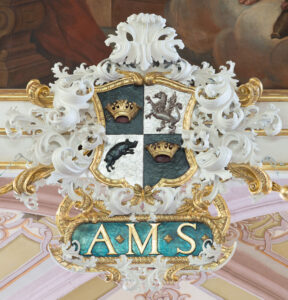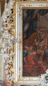 Opis: Rama obrazu, o kształcie pionowego prostokąta, w swej zasadniczej części zbudowana jest ze stosunkowo szerokich listew, tak wyprofilowanych, że stwarzają iluzję większej niż faktyczna głębi ramy. Na zewnątrz i od wewnątrz głównej partii ramy oraz pośrodku, między szerszymi listwami utrzymanymi w białym kolorze polerowanego gruntu, widoczne są trzy wąskie profilowane listwy złote (listwa najbliższa pola obrazu nieco szersza). Ujmowane przez nie listwy białe są: wewnętrzna szersza od zewnętrznej i wklęsła, natomiast druga, węższa, ustawiona na wprost ku widzowi. Na obu tych listwach widać nałożone motywy ornamentalne rozmieszczone w granicach szerokości listew, płaskie, złote, z pofalowanych cienkich gałązek z listkami i nielicznymi kwiatkami; wzory roślinne uzupełniają zwoje mało urozmaiconych ornamentów z odcinków taśmy. Opisane motywy występują blisko narożników oraz pośrodku bocznych i górnego odcinków ramy. Przy bokach pionowych oraz przy krawędzi górnej ramy rozmieszczone są na zewnątrz niej plastyczne, ażurowe „uszy” – zwoje liści akantu w białym kolorze polerowanego gruntu, o nieco suchej stylizacji, przeplecione z odcinkami dość wąskiej, złotej, poprzecznie rowkowanej wstęgi o końcach zawiniętych wolutowo. Zwój ornamentu przy krawędzi górnej ukształtowany symetrycznie, na osi nieznacznie podwyższony. Tutaj widoczna listwa wygięta ku górze na linii płytkiego łuku odcinkowego, dekorowana rzędem wolich oczu. Powyżej górnej krawędzi tej litwy skręcone, mało wydatne odcinki wici, a bezpośrednio na niej, na osi widoczny kwiat róży (?). Poniżej listwy, na jej osi widoczny krótki odcinek pionowo ustawionej wici. Po jego bokach rozmieszone dwie złote, ugięte na końcach ku dołowi gałązki z kulistymi owocami. „Uszy” boczne na zewnątrz ramy o krawędzi mocno nieregularnej, lekko wygiętej na zewnątrz. W połowie wysokości bocznych „uszu” odchodzą od nich niezbyt wydatne, białe, ażurowe gałązki zachodzące na zewnętrzne listwy ramy. Przy dolnej krawędzi ramy, po bokach podwieszone są dwie częściowo ażurowe, biało-złote girlandy, których zewnętrzne końce podczepione są do spiralnie skręconych dolnych końcówek wstęgi zdobiącej „uszy” po bokach ramy. Girlandy niemal symetryczne, zbudowane z wici akantowej i gałązek z małymi pąkami, uzupełnione są dużymi i małymi kwiatami w projekcji górnej. Wewnętrzne końce girland doczepione są do symetrycznego kartusza nałożonego pośrodku dolnego odcinka ramy. Kartusz górą występuje na pole obrazu, a dołem sięga poniżej linii girland, mocno odstaje od powierzchni ramy. Jego zdobienia są w większości plastyczne i ażurowe, a krawędź zewnętrzna kartusza jest nieregularna, ukształtowana zgodnie z przebiegiem motywów ornamentalnych. Ogólny kształt kartusza zbliżony jest do owalu, w którego centrum widoczna jest tarcza herbowa, o kształcie prostokąta obwiedziona złotą wstęgą, nacinaną w sporych odstępach. Tarcza od góry zamknięta jest spłaszczonym łukiem odcinkowym. Taśma stanowiąca obramienie tarczy herbowej od góry jest na jej osi przerwana a końcówki taśmy zaakcentowane są małymi wolutami. Po bokach tarczy herbowej widać wcięcia na linii płytkich łuków odcinkowych. Od dołu tarcza zamknięta jest trójlistnie, a na osi widoczne jest przewiązanie w formie zbliżonej do kokardy. Na opisanej tarczy umieszczone jest godło herbowe. Główny motyw dekoracyjny całego kartusza, w centrum którego tarcza została umieszczona stanowią zwoje białej wici akantowej, z tyłu których wyrastają po bokach w czterech miejscach odcinki złotej, poprzecznie rowkowanej wstęgi zakończonej spiralnymi skrętami. Na osi całego kartusza nałożonego na ramę obrazu widoczny u góry biały, płasko rozłożony liść akantu. Na osi, poniżej tego głównego kartusza dodatkowo umieszczony jest jeszcze jeden kartusz w bogatej oprawie, przeznaczony na inskrypcję. Kartusz w formie poziomo rozciągniętego prostokąta z półkolistymi zakończeniami na osi poziomej, o polu niebieskim, otoczonym oprawą głównie złotą, m.in. zbudowaną z rowkowanego lekko ukośnie wałka (jakby sznura) i rozmieszczonych na zewnątrz niego odcinków poprzecznie rowkowanej wstęgi o końcach zwiniętych spiralnie, górne odcinki tej wstęgi zawieszone są liściach akantu należących do oprawy tarczy herbowej. U dołu poziomego kartusza z inskrypcją i na jego obrzeżu symetrycznie splecione białe odcinki drobnej wici akantowej. W tarczy w centrum głównego kartusza zachodzącego na dolny odcinek ramy widoczne jest godło miasta Świdnicy. Herb podzielony jest na cztery pola. W ciemnoniebieskim polu górnym prawym (heraldycznie) oraz takiegoż koloru dolnym lewym (heraldycznie), umieszczono powtórzone godło w postaci złotych otwartych koron królewskich. W polu górnym lewym (heraldycznie) na tle srebrnym wyobrażony jest srebrny, kroczący gryf skierowany w prawą (heraldycznie) stronę. Pole dolne prawe (heraldycznie) zawiera na srebrnym tle godło w postaci rozmieszczonego ukosem (z łbem u góry po lewej – heraldycznie – stronie) ciemnoniebieskiego dzika wspartego na tylnych nogach. Ponad tarczą nie ma klejnotu, a po bokach brak jest labrów (zwoje akantu tu rozmieszczone pełnią funkcję dekoracyjną). W poziomym polu u dołu wzmiankowanego kartusza umieszczone są złote litery „A. M. S.”. Na ścianie z tyłu znajduje się namalowany (?) ciemnobrązowy napis nie powiązany bezpośrednio z ramą, ale ważny dla sprecyzowania jej historii. Napis ten brzmi (w odczycie Sobiesława Nowotnego): po prawej (heraldycznie) stronie w pionowej kolumnie: „Cristoff | Riedel | Tischler|gesell | Anno | 1725” oraz również w pionowej kolumnie, po lewej (heraldycznie) stronie stanowiący kontynuację poprzedniego, krótszy i zaczynający się nieco wyżej od poprzedniego: „ist Verfertiget | wor