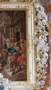 Historia: Niezwykle bogato zdobiona rama ujmuje wielkich rozmiarów obraz należący do rozmieszczonego na ścianach nawy cyklu poświęconego dwóm świętym patronom kościoła (i zarazem patronom krajów, z których się wywodzili): Stanisławowi biskupowi krakowskiemu i męczennikowi oraz Wacławowi księciu Czech i również męczennikowi. W ramę tu omawianą oprawiono obraz ilustrujący scenę z życia św. Wacława. Cały cykl powstał z inicjatywy jezuitów, ale tylko jeden obraz i jego ramę sfinansowało kolegium w Świdnicy. Zakonnicy, nie dysponujący odpowiednimi środkami pozwalającymi na zrealizowanie całego cyklu, prawdopodobne około 1710 roku ufundowali jeden obraz dla przykładu. Proces pozyskiwania fundatorów musiał trwać długo, skoro ostatni obraz – ten, którego ramę tu prezentujemy – zawisł na ścianie nawy dopiero w 1725 roku. Wiemy o tym z dość wyjątkowego napisu, który został umieszczony bezpośrednio na ścianie (na tynku) za obrazem. Sądząc z treści napisu powstał on niedługo przed powieszeniem wielkiego malowidła oprawionego w bogatą, masywną ramę. Niemiecką, oryginalną wersję napisu zacytowano w opisie, natomiast jej tłumaczenie na język polski, dokonane przez Sobiesława Nowotnego, wybitnego znawcę przeszłości Świdnicy, brzmi następująco: „Christoph Riedel czeladnik stolarski. W roku 1725 praca ta została wykonana”. Ta inskrypcja, wyraz dumy z udziału w zrealizowaniu tak okazałego dzieła, dostarcza cennych informacji, ale przede wszystkim mówi jednoznacznie o wykonaniu ramy w 1725 roku. Ramy, a nie obrazu dlatego, że inskrypcję wyraźnie podpisał czeladnik stolarski. Zresztą nie jest wykluczone, że obraz – na pewno tańszy od ramy, zważywszy na stopień jej skomplikowania i dużą ilość kosztownych złoceń – powstał nawet kilka lat wcześniej. Nie wiemy natomiast do jakiej pracowni przynależał podpisany na ścianie Christoph Riedel. Możliwe że współpracował z jednym z mistrzów świdnickich wymienianych w źródłach jako wykonawcy ram. Byli to: Tobias Franz Stallmeyer i Johann Karl Schönheim. Jednak wydaje się bardziej prawdopodobne, że czeladnik o którym mowa należał do ekipy na stałe pracującej w konwencie świdnickim, kierowanej przez wybitnego rzeźbiarza, podówczas już jezuitę, Johanna Riedla (1654-1736), uważanego za projektanta wszystkich elementów barokowego wystroju obecnej katedry. Zastanawiająca jest zbieżność nazwisk kierownika zakonnej pracowni oraz czeladnika, który wykonał inskrypcję: może Johann Riedel protegował do pracy przy wystroju kościoła swojego krewnego o imieniu Christoph? Gdy mowa o historii ramy jeszcze jeden element jest ważny i może dostarczyć ciekawych informacji. To herb umieszczony u dołu na ramie i inskrypcja poniżej (ograniczona do liter „A. M. S.” co po rozwinięciu oznacza, jak to ustalił Sobiesław Nowotny: „Amplissimus Magistratus Svidnicensis” czyli „Jaśnie oświecony magistrat świdnicki”) odnoszą się do Rady Miejskiej Świdnicy.