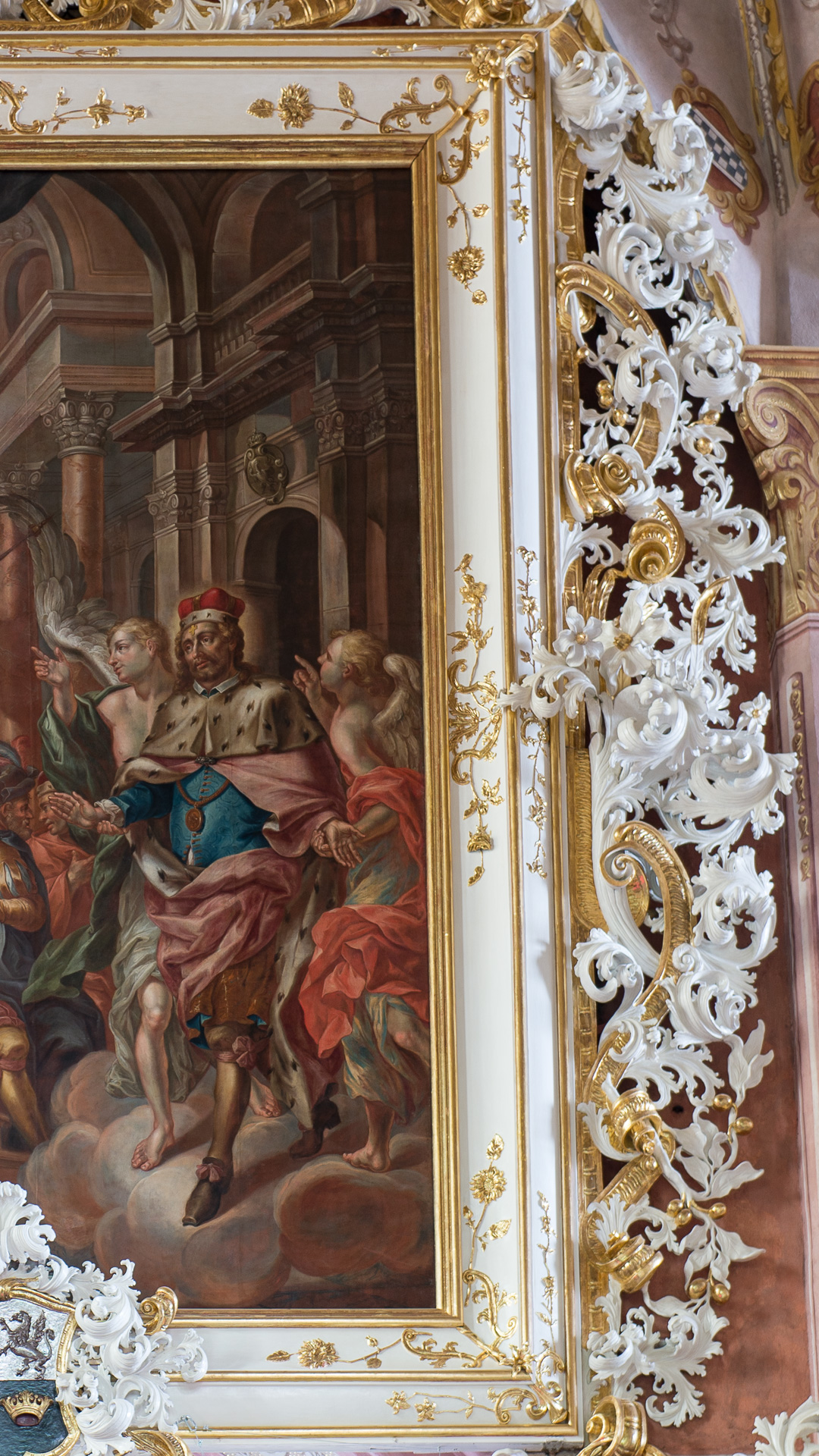 Charakterystyka: Decyzja o wykonaniu dla świdnickiej świątyni wielkich malowideł ilustrujących życie jej patronów była oczywista ze względu na obecny w tym kościele żywy kult liturgiczny wymienionych świętych. Jak już była o tym mowa jezuici – zapewne dla przykładu – ufundowali tylko jeden obraz. Trzy z pozostałych wykonano ze środków przedstawicieli najpotężniejszej śląskiej arystokracji. Kolejny obraz ufundował magistrat Świdnicy, co potwierdzone jest skróconym do pierwszych liter określeniem tej społeczności. Także herb powyżej wyraźnie identyfikuje miasto jako fundatora. Co charakterystyczne, w przeciwieństwie do herbów rodów arystokratycznych donatorów widocznych na trzech innych ramach, herb na tej ramie pozbawiony jest klejnotu i labrów – ograniczono go do samej tarczy. Na tarczy tej umieszczono godło w kształcie nadanym mu przywilejem króla Czech Władysława Pogrobowca z 1452 roku, stosowanym dopiero od 1501 roku. Symbole umieszczone w czteropolowej tarczy pozwalają odczytać niejako tożsamość i historię miasta. Dwie czeskie korony królewskie przypominają o długiej przynależności Świdnicy do tego królestwa, a także odnoszą się do faktu, że Świdnica była stolicą aż dwóch księstw: świdnickiego i jaworskiego. Natomiast gryf i dzik widoczne w pozostałych polach odnoszą się do dwóch najważniejszych urzędów miejskich: Rady i Ławy. Zaproszenie magistratu Świdnicy do ufundowania obrazu do kościoła jezuitów wydaje się naturalne, a to dlatego, że istniejące ówcześnie prawne nakazy sprawiały, że członkami Rady Miejskiej i urzędnikami mogli być wyłącznie katolicy. Zaproszenie rajców do ufundowania ramy sprawiło, że ta fundacja miała charakter manifestacji przywiązania miasta (a właściwie głównie jego władz) do religii katolickiej, co było ważne jeśli wziąć pod uwagę, że większość mieszkańców stanowili podówczas wyznawcy kościołów reformowanych. Sobiesław Nowotny w swoim jeszcze nie opublikowanym opracowaniu poświęconym herbom na ramach i ich fundatorom przyjął, że rama obrazu Św. Wacław przed cesarzem zrealizowana została za czasów kadencji grupy znanych z imienia urzędników miejskich sprawujących swoje funkcje przez rok, w okresie od 11 listopada 1724 roku (św. Marcina) do 11 listopada 1725 roku. Niewiele o nich wiemy (poza imionami, nazwiskami i pełnionymi funkcjami) trudno więc powiedzieć, którzy z nich byli bezpośrednio zaangażowani w fundację obrazu i ramy. Natomiast z całą pewnością dużo miał do powiedzenia w tej sprawie ówczesny burmistrz Świdnicy Johannes Balthasar Sommerfeld (zmarły przypuszczalnie w 1725 roku). Wiemy o nim sporo: od 1688 roku aż do śmierci bez przerwy sprawował różnego szczebla urzędy w Radzie Miejskiej i Ławie Miejskiej, której w początkach kariery był sekretarzem. Musiał, jak z tego wynika posiadać odpowiednie wykształcenie, być może uniwersyteckie. Był także z pewnością gorliwym katolikiem o czym świadczy nie tylko udział w fundacji obrazu i ramy z obrazem Św. Wacław przed cesarzem, ale też samodzielne donacje na rzecz wykonania elementów barokowego wyposażenia jezuickiej świątyni, obecnej katedry. Między innymi w 1709 roku Sommerfeld, podówczas radny miejski, przeznaczył sumę 20 florenów na wykonanie do nawy głównej świątyni figury swojego patrona, św. Jana Chrzciciela, należącej do cyklu figur osobno omawianych w tym przewodniku.