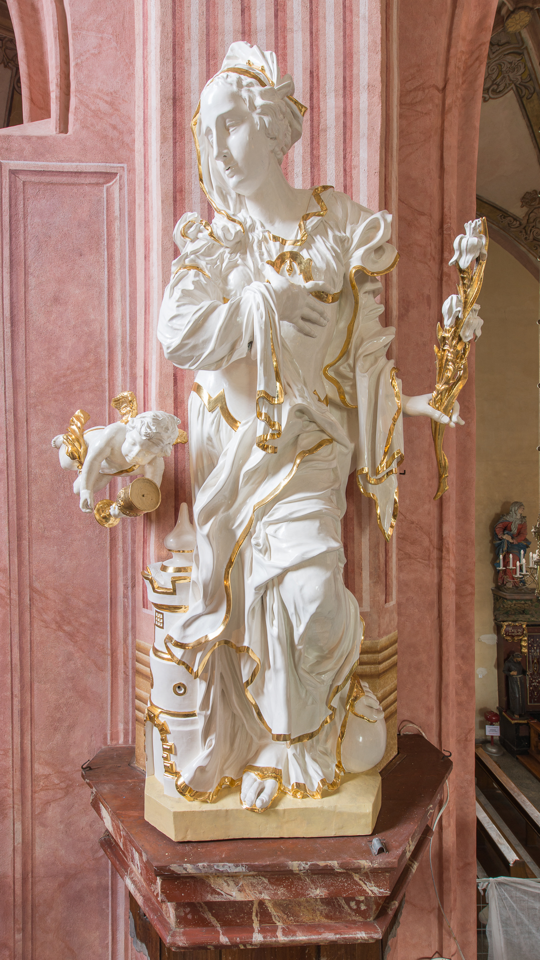 Opis: Całopostaciowe, niemal pełne ale lekko ścięte z tyłu i wydrążone przedstawienie stojącej Św. Barbary ustawione na konsoli zawieszonej na filarze. Konsola wydatna, ozdobiona od przodu masywnym wolutowym kartuszem poprzedzonym od dołu rodzajem podwieszonej rowkowanej „muszli”. Kartusz w białym kolorze polerowanego gruntu, z boków dekorowany liśćmi; w jego centrum owalna tablica ze złotym napisem na czerwonym tle: „In honorem | S. BARBARAE | Virg. Mart.”. Ponad kartuszem górna część konsoli, wieloboczna, profilowana w formie gzymsu, pokryta brązową marmoryzacją. Na górnej powierzchni konsoli dodatkowa podstawa pod figurę w formie grubej płyty. Święta ukazana w ożywionym ruchu, w silnym kontrapoście, z lewą nogą zgiętą w kolanie i opartą o kulę oraz prawym biodrem mocno uniesionym ku górze i wysuniętym w bok – sylwetka świętej przybiera dzięki temu kształt esowaty; obie stopy świętej obute w sandały na bosych nogach. Głowa skierowana w 3/4 w bok, w prawą (heraldycznie) stronę, jest lekko pochylona ku dołowi; twarz o pełnych, ale delikatnych (choć równocześnie mocniej podkreślonych ze względu na odległość figury od widza), idealizowanych rysach młodej kobiety. Na włosach mocno pofałdowany zawój draperii spływający fałdą przy prawym policzku. Ręce zgięte w łokciach; prawa dłoń pełnym egzaltacji gestem złożona na piersi świętej; lewa w układzie pełnym niemal tanecznej gracji z dłonią odsuniętą w bok od ciała trzyma białą lilię o złoconej łodydze; stopy w sandałach. Barbara ubrana w długie, dekoracyjnie ułożone i bardzo pofałdowane (głównie w drobne fałdy) szaty (charakter fałd utrudnia odczytanie przebiegu szat i ich części: widoczny m.in. rodzaj gorsetu świętej, mający w tej formie zapewne nawiązywać do kostiumu antycznego?). Obok prawej nogi męczennicy model wieży z oknami; na ścianie z prawej (heraldycznie) strony osadzona osobno wyrzeźbiona figurka aniołka w locie, z kielichem w ręku. Rzeźba w białym kolorze polerowanego gruntu, z drobnymi złotymi elementami: na konsoli z krawędziami wolutowych form kartusza oraz niektórymi drobnymi listkami; na szatach świętej wąskimi obramieniami; na wieży m.in. profilami; w obrębie postaci aniołka skrzydełkami, draperią i kielichem.