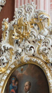 Owalny obraz ukazuje Św. Franciszka Borgię w otoczeniu atrybutów odrzuconych przez niego godności świeckich i kościelnych. Święty w stroju liturgicznym klęczy przed ołtarzem, na którym wyobrażono krucyfiks i obraz Matki Boskiej z Dzieciątkiem; ponad retabulum widać przedstawienie ukazującego się w obłokach kielicha z hostią. Rama, bardzo bogata, częściowo ażurowa, w białym kolorze polerowanego gruntu oraz złoceń, zbudowana jest ze splotów tzw. liści akantu, wzbogacono ją także motywami wstęgi, wolut, kwiatów i dwóch kadzielnic. Franciszek Borgia (1510-1572) to jedna z najważniejszych postaci z pierwszego pokolenia jezuitów. Pochodził ze słynnego hiszpańskiego rodu i przez znaczą część życia robił karierę na dworze królewskim. Po owdowieniu w 1546 roku, pod wpływem św. Ignacego Loyoli wstąpił do jezuitów i odegrał ogromną rolę w organizacji kształtującego się podówczas zakonu, którego został w końcu trzecim generałem. Zaangażowany w organizację wyprawy przeciw Turkom zagrażającym w tym czasie Europie dożył wielkiego zwycięstwa morskiego nad flotą osmańską pod Lepanto w 1572 roku. Na obrazie przedstawiony jest w otoczeniu atrybutów przywodzących na myśl jego rezygnację z życia świeckiego i licznych godności, także tytułu kardynalskiego. Wykonawcą tej części cyklu jest wrocławski malarz cechowy Johann Jacob Eybelwieser Młodszy (1667-1744). Są to jedne z jego najwcześniejszych dzieł. Niektóre z nich, przypominające w pewnym stopniu portrety, odznaczają się dynamicznym ujęciem, namalowane są przy tym z dużą starannością i subtelnością.