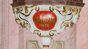 Opis: Całopostaciowe, w dużym stopniu pełne, ścięte z tyłu i głęboko wydrążone przedstawienie stojącego Św. Jana Chrzciciela ustawione na konsoli zawieszonej na filarze. Konsola wydatna, ozdobiona od przodu masywnym wolutowym kartuszem poprzedzonym od dołu rodzajem podwieszonej rowkowanej „muszli” (ten element nie zachował się do czasów najnowszej konserwacji i został zrekonstruowany na wzór oryginalnych widocznych przy innych figurach). Kartusz z boków dekorowany liśćmi; w jego centrum owalna tablica ze złotym napisem na czerwonym tle: „In honorem | S. JOAN[N]IS BAP: | TISTAE.”. Ponad kartuszem górna część konsoli, wieloboczna, profilowana w formie gzymsu, pokryta brązową marmoryzacją. Na górnej powierzchni konsoli dodatkowa podstawa pod figurę w formie grubej płyty. Obok tej płyty, na górnej części konsoli ustawione częściowo połączone z rzeźbą nieduże elementy, zaznaczające w umowny sposób pejzaż: po lewej (od patrzącego) widać małe drzewko i skałki (w postaci wielobocznych brył kamienia), po prawej skałki, które „podchodzą” do góry i łączą się z podobnymi skałkami umieszczonymi już na podstawie pod figurę, pod lewą stopą świętego i lewą nogą baranka; jeszcze bardziej na prawo, na tle ściany kościoła pnie się drzewko o bardzo długim cienki pniu zakończonym u góry mało wydatną koroną z liści – te dość ograniczone motywy (wątłe drzewka, skałki) mają niewątpliwie interpretować pustkowie, na którym przebywał św. Jan. Święty dość mocno poruszony, całą postacią zwrócony nieco w lewą (heraldycznie) stronę, z lewą nogą ugiętą w kolanie, wysuniętą ku przodowi i stopą wspartą na skałkach – przez co usytuowaną nieco wyżej niż prawa stopa. Prawa noga wyprostowana, częściowo cofnięta w stosunku do lewej, zakryta szatą świętego. Obie stopy bose. Głowa świętego obrócona w tym samym kierunku co jego korpus, nieznacznie pochylona. Twarz mężczyzny w średnim wieku, w intencji rzeźbiarza raczej dość młodego, pociągła, o głęboko rzeźbionych rysach, z długim nosem i zmarszczonym czołem. Włosy świętego gęste, w lokach, długie opadające z tyłu na szyję (pojedynczy lok także z przodu na lewy bark). Od dołu twarz okolona średnio długim zarostem. Święty w lewej ręce odsuniętej w bok od ciała, w dłoni widocznej na wysokości klatki piersiowej trzyma krzyż o bardzo długim dolnym ramieniu, ustawionym ukośnie i wspartym o podstawę figury. Wokół górnej części krzyża owinięta biała wstęga ze złotym napisem „ECCE AGNVS DEI”. Prawą dłonią trzymaną przez świętego z przodu na wysokości bioder, Jan dotyka łba baranka wspinającego się ku niemu przy lewej nodze. Święty ubrany w skłębione szaty odsłaniające część ciała: muskularny tors (na środku kępka włosów?) i lewą nogę powyżej kolana. Szaty spodnie o trudnym do prześledzenia przebiegu. Wierzchnie okrycie stanowi przerzucona przez przedramiona szata z wielbłądziej sierści. Rzeźba w białym kolorze polerowanego gruntu z drobnymi złotymi elementami: na konsoli z krawędziami wolutowych form kartusza oraz niektórymi drobnymi listkami; na szacie świętego z wełny wielbłądziej z obramieniami; ponadto złote są: krzyż i kopytka baranka. Skałki (grunt) u stóp świętego i u podstawy drzewek brązowe.