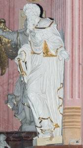 Opis: Całopostaciowe, w dużym stopniu pełne, ścięte z tyłu i głęboko wydrążone przedstawienie stojącego Św. Pawła ustawione na konsoli zawieszonej na filarze. Konsola wydatna, ozdobiona od przodu masywnym wolutowym kartuszem poprzedzonym od dołu rodzajem podwieszonej rowkowanej „muszli”. Kartusz z boków dekorowany liśćmi; w jego centrum owalna tablica ze złotym napisem na czerwonym tle: „In honorem | S. PAULI | Apostoli.”. Ponad kartuszem górna część konsoli, wieloboczna, profilowana w formie gzymsu, pokryta brązową marmoryzacją. Na górnej powierzchni konsoli dodatkowa podstawa pod figurę w formie grubej płyty.