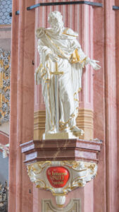 Historia: Figura jest jedną z dziewięciu rzeźb świętych ustawionych z inicjatywy jezuitów w 1710 roku na konsolach zawieszonych na filarach nawy głównej. Każda z rzeźb ufundowana została przez inną osobę – wykonanie figury Św. Pawła sfinansował prepozyt i dziekan z Kiełczyna Christoph Kirschbaum.