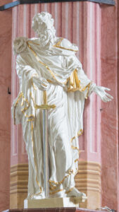 Figura, ustawiona na konsoli przymocowanej do ściany, przedstawia wyobrażonego w całej postaci Św. Pawła. Święty ukazany w lekko ożywionej pozie. Jego twarz okolona jest zarostem i włosami z bujną, długą, zasłaniającą szyję brodą; ubrany jest w obszerne, pofałdowane szaty. Paweł trzyma pod lewą pachą grubą księgę, a prawą dłonią przytrzymuje rękojeść dużego, pionowo ustawionego miecza. Figura jest w większości w białym kolorze polerowanego gruntu, złote są jedynie drobne jej elementy (w tym księga i rękojeść miecza). Św. Paweł, jeden z najważniejszych świętych w pierwszym wieku chrześcijaństwa, nie był Apostołem ani uczniem Chrystusa, ale nazywany jest Apostołem Narodów – nadał bowiem nowej religii wymiar uniwersalny. Towarzyszące mu atrybuty odwołują się: do mądrości św. Pawła - księga i do jego męczeńskiej śmierci w Rzymie – miecz.