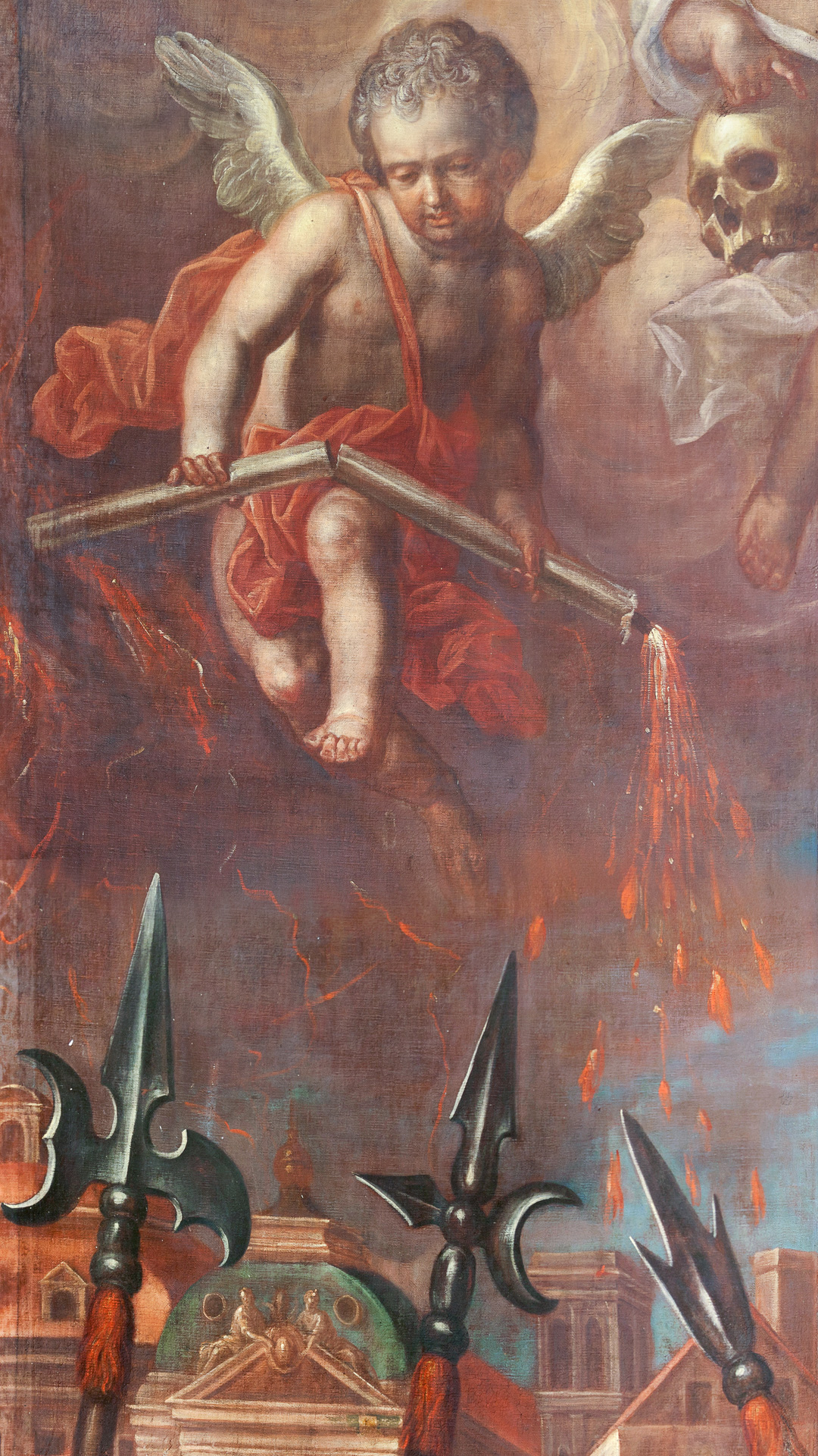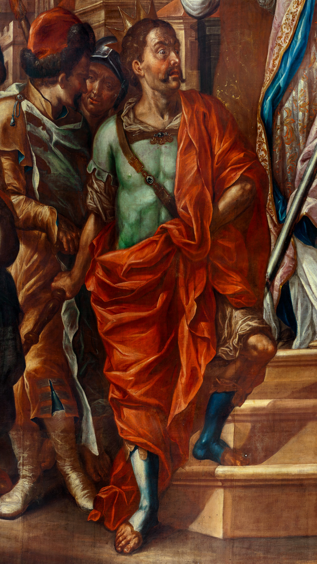 Opis: Obraz namalowany na podobraziu w formie pionowo ustawionego prostokąta. Kompozycja przedstawia św. Stanisława, biskupa krakowskiego rzucającego klątwę na króla Bolesława Śmiałego. Scena wielofigurowa, z tłumem postaci, o złożonej kompozycji. Całość rozgrywa się na tle brązowej (w odcieniach) i szarej architektury – przed wejściem do kościoła; z lewej strony od patrzącego) u góry, nieco na prawo (heraldycznie) od osi obrazu widoczny jest prześwit z niebem i obłokami. U dołu pierwszego planu przedstawiona jest brązowa ziemia. Po prawej stronie pola kompozycji (od patrzącego) wyobrażone zostało wejście do kościoła, usytuowane na podwyższeniu, poprzedzone trzema stopniami. Portal prostokątny, drzwi uchylone, za nimi widać wnętrze świątyni z elementami architektury. Portal flankują dwie kręcone kolumny, górna część fasady zasłonięta jest przez obłoki i ucięta przez krawędź obrazu. Na podeście przed wejściem do kościoła widać grupę złożoną ze stojącego na pierwszym planie św. Stanisława i trzech otaczających go duchownych widocznych z boków i od tyłu. Święty ukazany w całej postaci w ożywionym ruchu, zwrócony jest w 3/4 ku osi obrazu, jego sylwetka skręcona jest w formie przypominającej literę „S”, biodra nieznacznie wysunięte są w prawą (heraldycznie) stronę. Głowa świętego pochylona lekko w dół, twarz o rysach starszego mężczyzny okolona zarostem ze średniej długości brodą; zarost i widoczne fragmenty włosów brązowe. Stanisław w uniesionych w górę dłoniach, widocznych z lewej (heraldycznie) strony na wysokości szyi trzyma górną część ukośnie ustawionego pastorału, ubrany jest w strój biskupi (białą albę, ornat z brązowym wzorem tkaniny i kapę od spodu niebieską, wierzchem różowo-fioletową, spiętą pod szyją zaponą z klejnotem; przy szyi widoczny rąbek białego humerału, a na głowie osadzona jest infuła białego koloru, spodem niebieska, z klejnotem na osi); szaty świętego o sumarycznie potraktowanych, pełnych ruchu fałdach. Duchowni stojący przy świętym wyobrażeni w całej postaci (jeden częściowo widoczny z tyłu), w bardzo ożywionym ruchu, trzymający w rękach różne przedmioty (diakoni po bokach trzymają: lewy – od patrzącego – otwartą księgę, na którą prawdopodobnie spogląda święty, prawy – klucz; drugi klucz trzyma duchowny stojący za świętym). Dwóch diakonów po bokach ma na sobie białe alby, pod szyją humerały i czerwono-brązowe dalmatyki (w przypadku jednego z nich, najbliższego prawej krawędzi obrazu – od patrzącego – widać z jednego z boków dalmatyki niebieskie wstążki). Duchowny stojący za świętym ma na sobie słabo widoczny strój kanonika, na głowie ma czarny biret. Przeciwwagę dla grupy ze św. Stanisławem stanowi grupa żołnierzy towarzyszących królowi, zajmująca lewą (od patrzącego) połowę pola malowidła. Najważniejszą postacią jest tu monarcha, stojący blisko świętego, u stóp schodów, wyobrażony w całej postaci, przodem do widza, ale z głową zwrócona w 3/4 w lewą (heraldycznie) stronę. Jego twarz, o bardzo ekspresyjnym, wręcz brutalnym wyrazie, z „sumiastymi” wąsami zbliżona jest do sarmackiego typu znanego m.in. z portretów Jana III Sobieskiego i jego współczesnych choć jest oczywiście znacznie „przerysowana”); włosy i zarost postaci są brązowe. Lewą stopę władca stawia na pierwszym stopniu schodów, ręką z tej samej strony podparty jest pod bok. W prawej opuszczonej w dół ręce trzyma brązowe berło. Ubrany jest w szatę spodnią, antykizującą, szaroniebieską półzbroję (lub osłonę torsu z miękkiego materiału, np. barwionej skóry, opinającą ciało), czerwony płaszcz o zmonumentalizowanych fałdach i niebieskie buty zasłaniające łydki. Towarzyszący mu żołnierze stojący w ożywionych pozach w grupie za jego plecami, zwróceni są w stronę króla choć ich głowy odwrócone są w różne strony. Jeden z nich odwrócony tyłem do patrzącego, przedstawiony na pierwszym planie, najbliższy widzowi, patrzy się na tę grupę. Żołnierze trzymają broń drzewcową widoczną ponad ich głowami. Ubrani są w stroje przeważnie ponadczasowe, z drobnymi elementami nawiązującymi do mody orientalnej (np. futrzana czapka na głowie żołnierza ukazanego najbliżej króla); widoczne są tu barwy m.in. biała, zielona i różowa, odcienie brązu i szarości. W prawym (od strony widza) narożniku obrazu przedstawiony siedzący na kamieniu żebrak w poszarpanym stroju (brązowe spodnie, niebieski kaftan i brązowa czapka), z kijem, spoglądający na króla. Odpowiednikiem tej postaci w drugim dolnym rogu jest leżący na ziemi kamień, o którego stopę opiera ukazany od tyłu żołnierz najbliższy widzowi. Na dalekim planie w tle głównej sceny, u dołu wyobrażono brązowe zabudowania, powyżej których widać błękitne niebo z białymi obłokami. Przy górnej krawędzi, w przestrzeni obrazu na bliższym planie widoczne są biało-szare i różowe obłoki, a na ich tle wyobrażono postacie trzech fruwających aniołków okrytych barwnymi draperiami. Jeden z nich, najbliższy lewej (od widza) krawędzi obrazu trzyma złamaną świecę, kolejni idąc w lewą (heraldycznie stronę): środkowy ma w rękach czaszkę, a ostatni w lewej dłoni dzierży rózgę a w prawej miecz o płomienistej głowni.