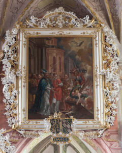 Characteristics: The decision to make large paintings illustrating the lives of its patrons for the church in Świdnica was obvious due to the lively liturgical cult of the saints mentioned in this church. The Jesuits, unable to commission all the necessary works due to financial difficulties, funded – perhaps for example – only one painting. Among the others, two were commissioned by well-known and influential clergymen, probably with the participation of the institutions they headed. As is indicated by the coats of arms and letters placed in the cartouche on the frame, the founder of the painting discussed here was primarily the abbot of the famous Cistercian monastery in Krzeszów in Silesia – Dominicus Geyer. However, the presence of an equally treated coat of arms of the Krzeszów convent itself allowed Sobiesław Nowotny, an eminent researcher of the history of Świdnica, to interpret – slightly differently than previously done – the letter abbreviations appearing on an additional cartouche below the coats of arms: “D. A. & C. G.” The quoted historian quite rightly sees in these letters abbreviations of words: “Dominicus Abbas & Conventus Grissoviensis” (“Dominik abbot and convent in Krzeszów”). Such an interpretation seems understandable if we take into account the fact that Geyer had to use the resources of the extremely rich Krzeszów Abbey when funding the large painting for the church in Świdnica. It is worth remembering, however, that decisions regarding the spending of specific sums from the monastery’s treasury always belonged to the abbots. However, in the Baroque era, Krzeszów was exceptionally lucky to have outstanding superiors. Dominicus Geyer (1662-1726), the 42nd abbot in Krzeszów, was born into a bourgeois family in Nysa, raised in Jesuit schools, and joined the Cistercian Order in 1680 in Krzeszów. He achieved the high position of professor of philosophy and theology in his convent, but he was also entrusted with the supervision of the construction of the church of St. Joseph, the second temple of the abbey. Highly regarded by his confreres, in 1696 he was unanimously (with his opposition) elected abbot – thus he became the successor of the famous predecessor Bernhard Rosa. Geyer held his position for 30 years and made an excellent contribution to the history of the monastery by increasing its assets. The most famous of the numerous buildings erected on his initiative is undoubtedly the 12 wooden houses (so-called Twelve Apostles) in Chełmsk Śląski, preserved to this day, for the weavers brought there on Geyer’s initiative. The abbot of Krzeszów was very friendly with the Świdnica Jesuits, his sacrifices for the convent and his care for the student congregation are known. To these expressions of interest and sympathy, the abbot added the foundation of a large painting – one of the most important in the entire cycle – for the Jesuit temple.