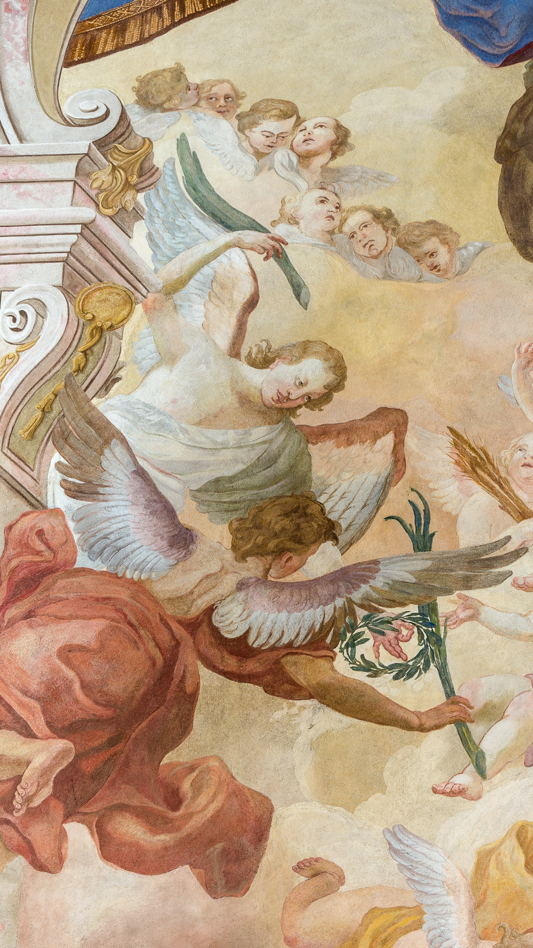 Description: The composition fills the upper part of the surface of the side wall of the span, closed from the top with a pointed arch (hereinafter this surface is also referred to as the field). Almost all architectural and ornamental elements used to decorate the bay and to separate it from the adjacent bays (the chancel from the east and the central nave from the west) are painted in an illusionistic way (the few that exist are especially emphasized at the beginning of the description). In the upper part, the flat surface of the wall meets the triangular in projection, spherically bent upwards, gently pointed vault (called kozuba – here referred to as the “lunette”). The walls of the lunette and their painting decoration (due to the coats of arms found there) are partly included in the description of the field, at its end. The walls of the lunette from the outside are framed with ribs dividing the vault visible above into smaller fields. The ribs flow down to short, wide, flat bands supported from the bottom by consoles, which protrude less and less from the wall as they go down, and finally blend into it. The above-mentioned architectural elements are the only ones with which the described side wall area is in contact. Their continuation is the illusionistic painting decoration described below. Paintings of the field of the bay wall in its upper part, visible above the pseudo-altar with a large painting of the Martyrdom of St. Wenceslaus, is covered with painted architectural, ornamental, and figural decorations (in the further part of the description, this decoration is treated as a collection of actually existing artistic motifs, sometimes without indicating that these are illusionistic representations, rendered in a layer of paint on a flat surface of plaster). The area of the side wall of the bay is primarily filled with architectural motifs separating this area from the surface of the next eastern bay of the chancel and the west of the first bay of the nave. Architectural motifs also organize the surface of the top part of the wall, which is in contact with the lunette and is bounded by a pointed arch. Elements of the vertical divisions of the main field below seem to “emerge” from behind the pseudo-altar set below this wall. The wall surface is filled with a window at the bottom of the group described below, glazed with hexagonal tiles framed in a narrow strip, entirely adopting the “honeycomb” pattern. These tiles respect the vertically running four profiled sticks dividing the window surface into five parts. In addition, within the glazing, there are expressive horizontal strips separating the quarters and additional horizontal and vertical divisions of the quarters. Abov the glazing covering about 1/4 of the window’s height, there is a complex figural composition with an irregular outline (description below). In its upper part, a large opening is visible, within which you can see a smooth sky and not a continuation of the window glazing. The frame of this window is rich, composed of many architectural elements, more like a portal than a window frame, with all components fully visible only from the left side of the window. From this side, by showing the glyph of the window (set at right angles to the glazed surface), a rather significant thickness of the wall is marked in a perspective foreshortening. The window on the sides is framed by massive, rectangular pillars embedded in the wall, and further by pilasters set at right angles to the pillars, already embedded on the front surface of the church wall. Pilasters and pillars on the surfaces facing the viewer, decorated with different panels – those on the surface of the pillars are decorated at the very top with types of strongly stylized “bows” made of leaves and volute forms, from which sections of flagella hang down. At the top of the side surface of the pillars (visible in the thickness of the wall) and the front surface of the pilasters, there are massive heads in the form of volute consoles. On the pillars, smaller capitals are supplemented from above with smooth cartouches and strings of flagella flowing downwards. On the pilasters, capitals larger than those previously described are decorated with: rows of overlapping sequins, winged heads of angels, and massive garlands. The consoles on the pillars and pilasters support the step-shaped cornice, broken at their contact. Above the pillars, there are stepped profiled imposts on which a horseshoe arch is supported, closing the arcade containing the window from above. The arch is framed by a wide, stepped band from the outside, finished with small volutes at the bottom. The arch from the bottom, on the surface of the wall thickness, is decorated with symmetrically arranged panels, volutes, a rosette (on the axis, at the top of the arch), and coils of a ribbon ornament similar to the arrangement of the Regency ribbon. The area in the depths of the arcade, above the described glazing of the window, is filled from the level of about 1/4 of the height of the visible part of the arcade (going from the bottom) with a composition containing billowing clouds surrounding the empty surface of the sky with smoothly shaped clouds above. The clouds are complemented by a tangled curtain visible at the top and on the right side of the arcade, finished with fringes at the bottom edge. Angels (including three in the form of adults) and angel heads are visible against the background of clouds, sky, and curtains. Angels in extremely lively, complicated poses, wrapped in draperies, hold attributes of the dignity of St. Wenceslaus (prince’s miter and scepter?) and grapes, ears of corn, palm leaves, and a laurel wreath. The wall decoration elements described so far are kept in slightly subdued, pastel colors. Walls and their decoration: white, greenish, and yellowish-brown, windows in the window pale blue. The clouds and the sky are white, sometimes in shades of pink a