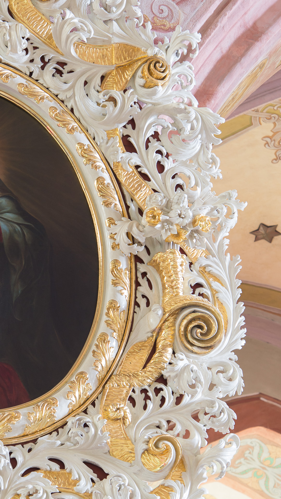 Provenance: The painting belongs to a series of nine compositions funded by the Świdnica Jesuits as part of the baroqueization of the Gothic interior of the church in Świdnica, which lasted several decades. The paintings were commissioned in 1700 by two Silesian painters: four from Knechtl and five from Johann Jacob Eybelwieser the Younger. Knechtel probably painted his paintings quite quickly, already around 1700, while Eybelwieser – judging from the signatures and dates discovered during the conservation works on some of his paintings from the series (including the painting of the Virgin Mary discussed here) – completed his part of the commission in 1710 and it was probably then that rich frames for all the canvases were made.
