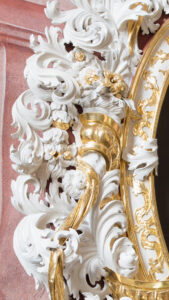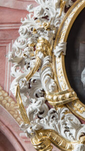 Description: The oval image contains a depiction of a saint adoring a crucifix held in his hands. The saint is depicted against a very dark background, maintained in shades of brown, brightened only at the very top of the image field, where against the background of a rusty sky, clouds, and glory made of rays of light, a flying dove of the Holy Spirit is depicted. Aloysius Gonzaga is shown almost in full form, in a dynamic pose, kneeling, turned in three quarters – also with his head – to the heraldic left, slightly bent. He is holding in both hands (the saint’s right hand is placed much lower than the left) a diagonally positioned crucifix of considerable size. With his left forearm, the saint also holds a green branch with white lily flowers. Aloysius’ head is bent, close to the figure of Christ. Gonzaga has the delicate features of a young man and a face with a pale pink complexion, with short dark brown hair. The saint is dressed in a black cassock whose tangled folds are visible at the bottom of the picture. A slightly open collar is visible at his neck, above which the similarly open collar of his under-white shirt is visible. A corrugated white surplice is worn over the cassock, decorated with delicate lace at the uppercut and the lower edge. The arms of the cross held by the saint are in the color of dark wood. The figure placed on the cross is presented realistically (Christ’s head turned away from the saint), with a large dose of expression, painted in a naturalistic convention. At the bottom of the picture field on the right, looking from the viewer, there is a light brown table with a red pillow, on which lies upside-down a princely miter in red and gold, trimmed with ermine fur. The frame is partially openwork. It has a general outline of an oval, slightly elongated on the vertical axis. At the top, the decoration of the frame is a bit more elaborate, it has the character of a finial, on the axis of which, directly above the painting, there is an oval cartouche. The frame is cut straight from the bottom. Constructed of symmetrical, multi-layered weaves of acanthus flagella maintained with a sharp styling (but not yet withering) and finer floral motifs, in the white color of the polished primer. The described weaves are enriched with motifs wholly or partly gold: profiled slats, sections of a gathered ribbon of various widths, mostly twisted (with volute endings), independent volutes, lily flowers, and a horn with flowers (at the top of the frame).