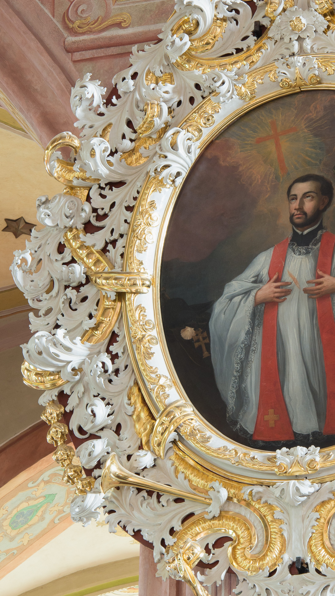 Description: The oval image contains a depiction of St. Francis Xavier in religious and priestly clothes, surrounded by attributes. The saint is shown in a standing (or kneeling) position – wide robes make it difficult to determine the pose), 3/4 of the figure’s height. Francis is depicted almost frontally, with his head very slightly turned to the right (heraldic) side and slightly raised. A face with portrait features, of a rather Mediterranean type, with a wide forehead and a prominent straight nose, with large ears (left visible), with slightly parted lips, framed by very dark: short stubble and also short hair; dark eyes lifted upwards, slightly pink complexion. Both hands of the saint are bent at the elbows, the fingers touch the breasts – between them, you can see flames coming out of the body. Ksawery was dressed in a habit with a white collar of his lower robe visible at the neck and in a grey-white surplice, richly folded, with very wide sleeves, trimmed with lace at the edges. A red stole is thrown over the neck, falling from the front ends to the very bottom of the figure (light brown crosses at the ends). On the left side of the picture, at the right elbow of the saint, his attributes are visible. This part of the composition is mostly in very dark, grey-green tones, against which two objects stand out – yellowish and grey-white: a cross with two horizontal arms (similar to a carawaki) and a pilgrim’s shell; a pilgrims hat visible above. On the right side of the composition field, at the top, there are elements of monumental architecture: a gray-brown column on a pedestal partly covered with tangled dark green drapery. On the opposite side, at the top, against the background of the sky covered with gray-pink clouds, illuminated in the central part by the glory of yellow rays, a simple red cross is depicted. Partially openwork frame. In the general outline of an oval, slightly elongated on the vertical axis (slightly more from the top, where it has the character of a finial, at the top of which a large volute is placed); from the bottom, a frame with suspended festoons tied in the form of a bow on the axis. Constructed of symmetrical, multi-layer weaves of acanthus flagellum in the white color of the polished ground, with a sharp styling (but not withering yet) and gold motifs: profiled slats, sections of a wrinkled ribbon, usually twisted, and ribbons with the motif of cabochons and rows of campanulas. In the lower part, the composition is complemented by two horizontally arranged trumpets directed in opposite directions.