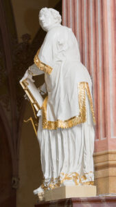 Description: A full-figure, almost full, cut-back and hollow depiction of a standing St. Lawrence set on a console suspended on a pillar. A prominent console, decorated from the front with a massive volute cartouche preceded from the bottom with a kind of suspended grooved “shell”. Side cartouche decorated with leaves; in its center an oval plaque with a golden inscription on a red background: “In honorem | S. LAURENTI | Mart.”. Above the cartouche, the upper part of the console, polygonal, profiled in the form of a cornice, covered with brown marbling. On the upper surface of the console, there is an additional base for the figure in the form of a thick plate. Saint is in a dynamic pose, strongly bent at the hips to the left (heraldically) side, with the right leg strongly advanced, bent at the knee, and with the left one withdrawn, practically invisible under the robes (except for the tip of the shoe); full boots visible on both feet. The saint’s head is turned in the same direction as his hips, raised, and turned three-quarters away from the viewer. The smooth, beardless face of a young man with full, slightly plump features. relatively short and strongly curled hair. The saint’s arms are bent at the elbows and directed to the heraldic right. Hands at the height of the hips: the right hand moved to the side from the body, holds the grate handle and the left one is visible slightly higher than the right one, against the background of the figure. The saint holds the upper edge of a book (undoubtedly the Gospel) with his left hand and the lower edge of the book rests on his right thigh. Book’s binding with decorative fittings at the edges, in the corners, and the middle of the cover. Lawrence is dressed as a deacon – he is wearing an alb, a dalmatic, and a humeral around his neck. The robes are folded in many places, e.g. at the bottom of the figure – strongly, with small folds; in other places with large smooth surfaces. Next to the saint’s right leg, resting on the base of the sculpture, there is an instrument of Lawrence’s martyrdom: a grate (with simplified forms and the handle directed upwards). The sculpture is in a white color of polished primer with small golden elements: on a console with the edges of volute forms of a cartouche and some small leaves; on the saint’s robes with alb frames at the bottom and decorations on the sleeves, dalmatic hems and some elements of the humeral; moreover, the grate and the fittings of the book are gold.