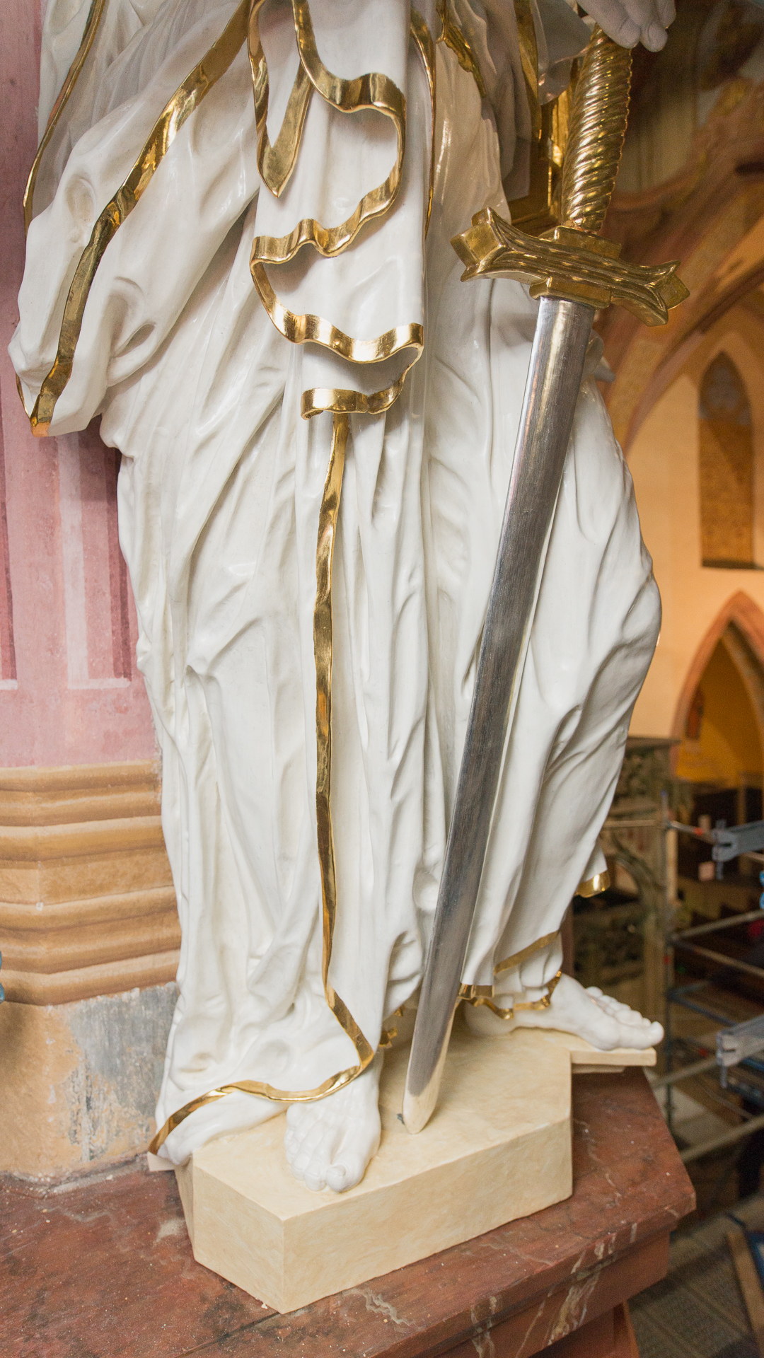 The saint is slightly moved, with his whole figure turned slightly to the left (heraldically) side (towards the main nave of the cathedral), with the left leg strongly moved forward, bent at the knee and the right one slightly withdrawn; both feet of the saint are bare. The saint’s head is turned even more in the same direction as his body, very slightly raised. The face is of an elderly man (mouth parted as if speaking), framed by very lush hair in thick curls and stubble with a long beard covering the neck. Paul has his left hand slightly moved away from the body and forward – he is holding a thick book under his armpit; in his right hand visible at the height of his hips Paul is holding the hilt of a massive sword.