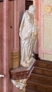Description: A full-figure, almost full, cut-back and hollow depiction of a standing St. Paul set on a console suspended on a pillar. A prominent console, decorated from the front with a massive volute cartouche preceded from the bottom with a kind of suspended grooved “shell”. Side cartouche decorated with leaves; in its center an oval plaque with a golden inscription on a red background: “In honorem | S. PAULI | apostles.” Above the cartouche, the upper part of the console, polygonal, profiled in the form of a cornice, covered with brown marbling. On the upper surface of the console, there is an additional base for the figure in the form of a thick plate.