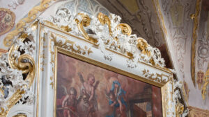 History: An extremely richly decorated frame encloses a large painting belonging to the cycle placed on the walls of the nave dedicated to the two saint patrons of the church (and also the patrons of the countries they came from): Stanislaus, the bishop of Cracow and a martyr, and Wenceslaus, the Czech prince and also a martyr. A painting illustrating a scene from the life of St. Stanislaus. The entire series was created on the initiative of the Jesuits, but only this one painting and its frame were financed by the college in Świdnica.