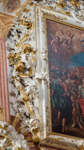 Characteristics: The decision to make large paintings illustrating the lives of its patrons for the church in Świdnica was obvious due to the lively liturgical cult of the saints mentioned in this church. The Jesuits, unable to commission all the necessary works due to financial difficulties, funded only one, thus setting an example for other potential investors of further commissions. Probably to show that people or institutions will be properly appreciated, and the memory of their generosity will last thanks to visible signs, they foresaw the presence of coats of arms on the frames of the paintings in the program of works. While this was the motivation of the Jesuits – encouraging the founders through a kind of “advertisement” – it must be admitted that it had a positive effect, and the coats of arms are exceptionally impressive. It seems that the painting discussed here may have been made first just after 1710, after finishing work on another series of slightly smaller compositions for the walls of the central nave: oval paintings depicting mostly Jesuit saints. The large rectangular painting discussed here could have been a kind of illustrative pattern for those willing to spend money on further paintings and frames. The emblem on the shield in the middle of the cartouche shows the sign of the Society of Jesus, adopted by its founder, St. Ignatius of Loyola. Already used in the Middle Ages, it was not a literal coat of arms, it was a kind of manifestation of faith with the saving power of Christ. The monogram of the letters “IHS”, presented in an oval field, most often translated as an abbreviation of the words “Iesus Hominum Salvator” (“Jesus the Savior of People”), is supplemented with the representation of a cross and a burning heart with three nails reminding of the bloody Passion of Christ. Visible under this image are the letters “C. S.I.S.” which should be interpreted as an inscription identifying a specific founder shortened to the first letters: “Collegium Societatis Iesu Svidnicense”, i.e. “Collegium of the Society of Jesus from Świdnica”. Probably the last painting in the series was hung in the nave in 1725 or not much later, and the frames and coats of arms, which required a great deal of work, were probably completed in the previous years. This gives grounds for saying that the culmination of many years of Jesuits’ efforts to make great paintings fell on the time when Lauretius Moser was the Rector of the College (1720-1728). Coming from the Czech Republic, an excellent theologian but also a talented administrator, he made a quick and brilliant career in the Society of Jesus, justified, however, by his outstanding abilities. Just two years after taking his vows, he was appointed superior in Świdnica. It was considered a difficult institution, both because of the mission among the local Protestants, and because of the arduous and costly work of decorating the church. Moser was then a superior at the College in Głogów and there, in 1730, he died as a result of injuries sustained after a tragic accident. However, he could have had the satisfaction that in his time in Świdnica, the difficult action of foundation for the nave of large paintings dedicated to the patrons of the temple came to an end.