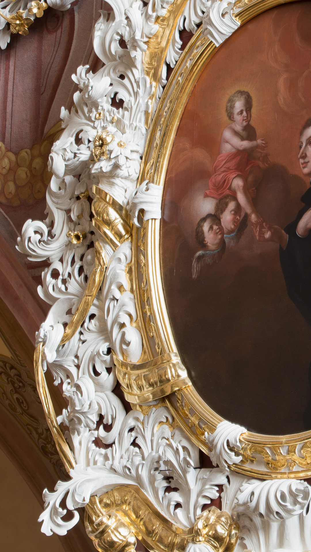 Description:The oval image contains a representation of the vision of St. Stanislaus Kostka, to whom the Child Jesus appears during prayer. The brown background of the representation, mostly uniform (“abstract”), in the upper part, especially on the left side of the composition, takes the form of slightly pink, illuminated clouds, lightened with white. St. Stanislaus is depicted in the right (looking from the viewer) half of the composition, kneeling and facing the heraldic right, shown from the knees, with his head slightly raised, with his right hand folded on his chest and his left hand extended forward. With his fingertips, the saint touches the foot of the right foot of Child, visible in the second half of the image, at the top, against the background of illuminated clouds. The face of a youthful saint, with delicate, rounded features, with a prominent nose; short, thick, dark (brown) hair surrounding the head; rather plump hands; white body complexion. Stanislaus Kostka wearing a black Jesuit habit, with his collar open at the neck, revealing a similarly open white shirt collar; hems of the undergarment are visible also at the ends of the long and narrow sleeves of the habit. In the left half of the picture, at the top, the Child is shown in full form, sitting on the clouds, facing the saint, with his right leg and hands extended towards him. Child’s face with almost “adult”, though delicate features, head framed by short blond hair, and a pale pink complexion. The naked body of little Jesus is covered with a dark pink drapery around the waist; below Infant’s feet, a pair of winged angel heads (gray-blue wings) is visible. Partially openwork frame. In the general outline of an oval, slightly elongated on the vertical axis. At the top, the decoration of the frame is a bit more elaborate, it has the character of a finial, on the axis of which, directly above the painting, a large shell is placed. The frame is cut straight from the bottom. Constructed of symmetrical, multi-layered weaves of acanthus flagellum in the white color of the polished ground, with a sharp styling (but not yet withering) and finer floral motifs and cornucopias on the sides of the frame. The described weaves are enriched with motifs wholly or partly gold: profiled slats, sections of a gathered ribbon of various widths, mostly twisted (with volute endings), independent volutes, lily flowers, and a horn, e.g. with large flower calyxes in the upper projection (at the top of the frame).