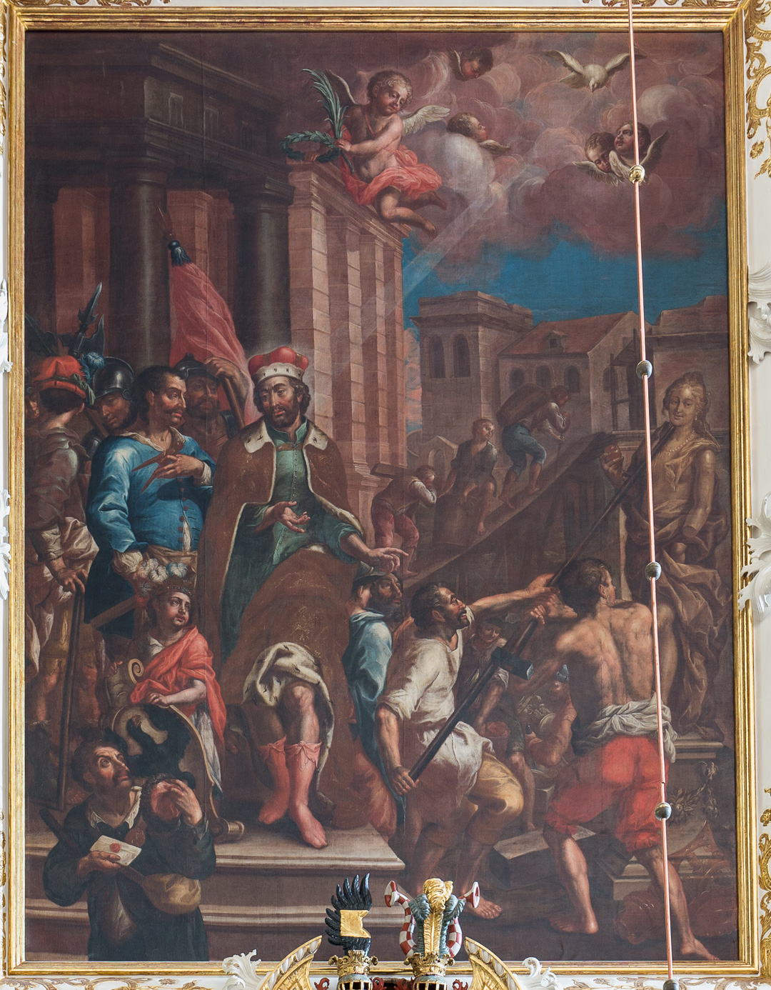 Characteristics: The decision to make large paintings illustrating the lives of its patrons for the church in Świdnica was obvious due to the lively liturgical cult of the saints mentioned in this church. Out of the six paintings that belong to this part of the cycle, which is located in the nave of the cathedral, three were made with the funds of representatives of the most powerful Silesian aristocracy. Attempts to identify all generous donors have not always been accurate. For example, the painting discussed here, taking into account the fact that the coat of arms on the frame belongs to the well-known Silesian von Nostitz family, was considered a gift from one of the unidentified members of this family. Only recently, the research of Sobiesław Nowotny, an eminent expert on the past of Świdnica, allowed us to determine that the abbreviated inscription below the coat of arms refers to Maria Elizabetha Countess von Nostitz, the widow of one of the most prominent Silesian aristocrats of that period. It was Christoph Wenzel, Count von Nostitz (1645-1712), the owner of numerous landed estates in the Duchy of Świdnica and Jawor. He was strongly associated with the Habsburgs and from 1692 he was the count of the Reich. In 1697-1703, he was the starost of the Duchy of Świdnica-Jawor. The gift of his wife, although marked with letters proving that it was made after the count’s death, can also be treated as the fulfillment of the ambitions of the Silesian magnate in the field of foundations for the Catholic Church in Silesia. Finally, it should be noted that the subject of the work was wrongly defined for a long time – it was defined as the image of St. Wenceslaus reconciling the two combatants, although even a cursory look at the details of the composition leaves no doubt as to the depicted scene. Perhaps the fault was the fact that the painting was hung in the nave at a considerable height.