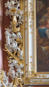Description: The frame of the picture, in the shape of a vertical rectangle, in its main part is made of relatively wide slats, profiled in such a way that they create the illusion of a greater than the actual depth of the frame. On the outside and inside the main part of the frame and in the middle, between the wider slats in the white color of the polished primer, there are three narrow, profiled gold slats (the slat closest to the image field is slightly wider). The white slats they capture are the inner one wider than the outer one and concave, while the other one, narrower, is set straight towards the viewer. On both of these slats, there are ornamental motifs placed within the width of the slats, flat, golden, and made of wavy thin twigs with leaves and a few flowers; floral patterns are complemented by scrolls of little varied ornaments made of tape sections. The described motifs occur near the corners and in the middle of the side and top sections of the frame. At the vertical sides and the upper edge of the frame, plastic, openwork “ears” are placed outside it – scrolls of acanthus leaves in a white color of polished primer with a slightly dry styling, intertwined with sections of a rather narrow, golden, cross-grooved ribbon with ends wrapped in a volute, overlapping on the side slats of the frame in 2/3 of the height. The decoration of the “ears” on the sides of the frame in two places is complemented by bouquets placed in cornucopias and bunches of smooth, golden stems. The scroll of the ornament at the upper edge is symmetrically shaped, slightly raised on the axis. Lateral “ears” with the outer edge very irregular, slightly bent outwards. At the bottom edge of the frame, on the sides, there are two partially openwork, white and gold garlands, the outer ends of which are attached to the spirally twisted lower ends of the ribbon decorating the “ears” on the sides of the frame. Almost symmetrical garlands, made of varied leaves and twigs with small flowers and ball-shaped fruits. The inner ends of the garlands are attached to a symmetrical cartouche placed in the middle of the lower section of the frame. The top of the cartouche extends onto the field of the picture, and the bottom reaches below the line of the garlands, sticking out strongly from the surface of the frame. Its decorations are mostly plastic and openwork, and the outer edge of the cartouche is irregular, and shaped take the courses of ornamental and heraldic motifs. The general shape of the cartouche is similar to an oval, although its main part, surrounded by an “inner” frame, is six-leaf. In the center, there is a heraldic shield in the shape of a rectangle closed from the top with an arch (hidden under the lower parts of three helmets constituting elements of the jewel, overlapping the edge of the shield). On its sides, you can see indentations on the line of shallow segmental arches. From the bottom, the shield is closed with two different arcs corresponding to the halves of the shield, touching on its axis: from the right side (heraldically) you can see a wavy, concave-convex arch, on the other side a segment of a convex segmental arch. On the shield, there is a coat of arms, and above it a three-piece jewel. On the right (heraldically) side of the coat of arms there are green libraries and on the left red ones. At the same time, they are the main decorative motif of the entire cartouche, in the center of which the shield was placed. The six-leaf “internal” frame (see above) of the main cartouche (set on the axis of the lower section of the frame) is gold, made of sections of a horizontally grooved ribbon ending with spiral twists (four upper sections of the frame) and two scarves at the bottom. Their inner ends are embedded in other decorative motifs of the cartouche, and the outer ones, finished with balls – located behind the place where the scarves are threaded through the twisted openwork acanthus leaves – are connected to the previously described garlands suspended to the lower edge of the frame. The other decorative elements of the cartouche with the coat of arms are white acanthus leaves intertwined with other motifs. On the axis, below, there is also another cartouche in a rich frame, intended for an inscription. Cartouche in the form of a horizontally stretched rectangle with semicircular endings on the horizontal axis, with a blue field, surrounded by a frame mainly in gold, incl. made of incised ribbon, tied on a vertical axis with doubled volutes made of sections of incised ribbon of a different type, as well as of white acanthus leaves. The coat of arms of the von Nimptsch family is visible in the shield in the center of the main cartouche overlapping the lower section of the frame. The coat of arms is divided into four fields. In the upper right (heraldic) silver field and the lower left (heraldic) silver field, there is a repeated emblem in the form of two gold open crowns of an indeterminate rank (usually defined by the number of “sticks”), with their open parts turned towards each other (fleurons of leaves acanthus). In the upper left field (heraldically) on a grey-green background there is an emblem in the form of a golden dragon sitting on a red base facing right (heraldically) and breathing fire. The lower right field (heraldic) has been divided horizontally into two parts, of which the lower one, reaching 1/3 of the height of the entire field, is brown and the upper one of a similar color as seen in the previously described field. A silver-gray palm tree is depicted in the upper field. The main shield of the coat of arms also has a heart field in the center in the shape of a slightly vertically elongated rectangular shield, semicircular at the bottom, crowned with a golden open crown made of fleurons from acanthus leaves (slightly similar to the pairs of crowns in the emblems visible nearby). The heart field is divided horizontally into two parts. In 