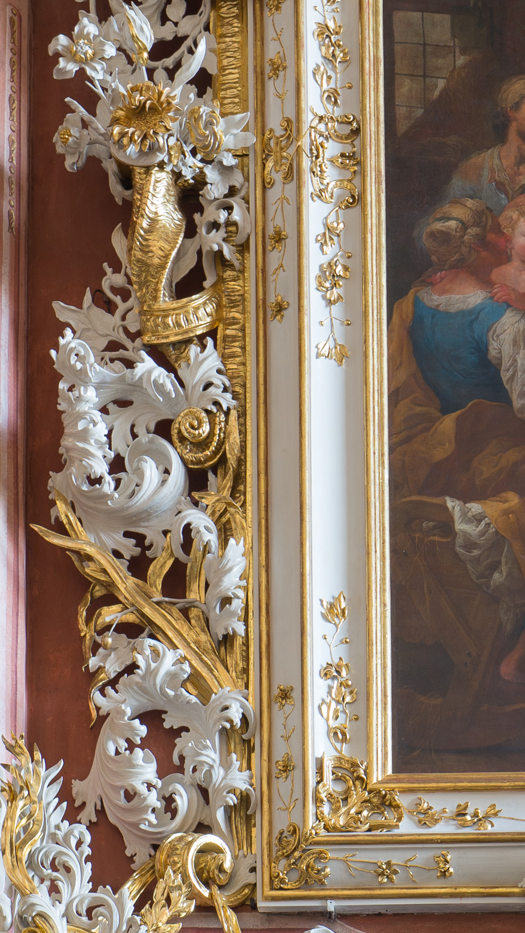 History: An extremely richly decorated frame encloses a large painting belonging to the cycle placed on the walls of the nave dedicated to the two saint patrons of the church (and also the patrons of the countries they came from): Stanislaus, the bishop of Cracow and a martyr, and Wenceslaus, the Czech prince and also a martyr. A painting illustrating a scene from the life of St. Wenceslaus. The entire series was created on the initiative of the Jesuits, but only one painting and its frame were financed by the college in Świdnica. The painting in question was funded by a well-known Silesian magnate, who is identified by the coat of arms and letters on the shield below. In this case, it was about the person hidden under the abbreviation “C. F.G.N.” – it was “Christoph Ferdinand Graf von Nimptsch” or “Christoph Ferdinand Count von Nimptsch”. We do not know the exact date of its foundation (the cycle began around 1710). However, probably, this work was not done until around 1720, when the painter was paid for the execution of the last two (out of a total of three) paintings showing scenes from the life of St. Wenceslaus.