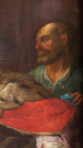 Description: A picture painted on a canvas in the form of a vertically positioned rectangle. The composition depicts St. Wenceslaus, the Czech prince coming to the poor who pay homage to him grateful for their generous gifts. A multi-figure scene with figures in various poses. The whole thing takes place in front of the brown walls of the room. On the right (from the viewer) side of the composition there is a wall with a portal shown in perspective foreshortening. Above the portal, high up in the corner of the composition, there is a shelf with a vessel and a bag tied. Below, in the background, is the corner of the room. The wall in the background, parallel to the plane of the painting, is partially obscured by a hanging line with drying laundry. Near the left edge of the image field, a glazed window is depicted at the top (two rectangular panels are visible, the lower of which is higher, additionally divided into smaller squares by narrow slats). A landscape can be seen outside the window. Below the upper edge of the picture, white-brown clouds have been painted that don’t fill the upper corners of the field. On the axis of this field, there is an angel covered with a white drapery, holding a green leaf in his hand. The bottom stage is the most important for the program of the entire performance. Through the door on the right (from the viewer) side of the composition enters the room of St. Wenceslaus with a servant: an elderly man with a beard, dressed in a green robe. Wenceslaus takes a step forward with his left foot, he is clearly shown in motion. The upper part of the silhouette and the head are 3/4 turned to the viewer; the visible face of a man in the prime of life, with dark stubble, beard, and long hair. The right arm of the saint is bent at the elbow, the hand raised vertically, visible at the height of the chest, and holds a bundle of wood, which he carries under his left armpit, with his left hand the prince holds the coat flap at the back, at the bottom. Wacław wears richly pleated robes (increasing the impression of movement): a green undergarment, a red cloak with an ermine collar, high brown boots, and a red miter decorated with an ermine at the bottom. A radiance shines around the saint’s head, by the light of which they entered the room. A group of poor people fills the left (from the viewer) part of the composition field (2/3 of the field at the bottom). Several people are gathered around a rectangular table placed at the bottom center in this part of the composition; set on a brown floor. On the table are crumpled gray and white tablecloths and brown dishes. Several people are visible in the background, with heads emerging behind the foreground and background figures. Among these people, in the foreground, the following are noteworthy: on the left (from the viewer) a crouching or kneeling man leaning towards the feet of the saint, and further to the right (heraldically) a young woman with blond hair, with a child, sitting on an armchair near the table. Behind the table, the next heroes of the scene: women and men visible in half-figures, turn towards the saint. The robes of the described poor people come in different colors: grey-white, blue, red, green, and brown.