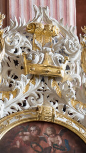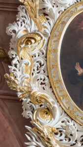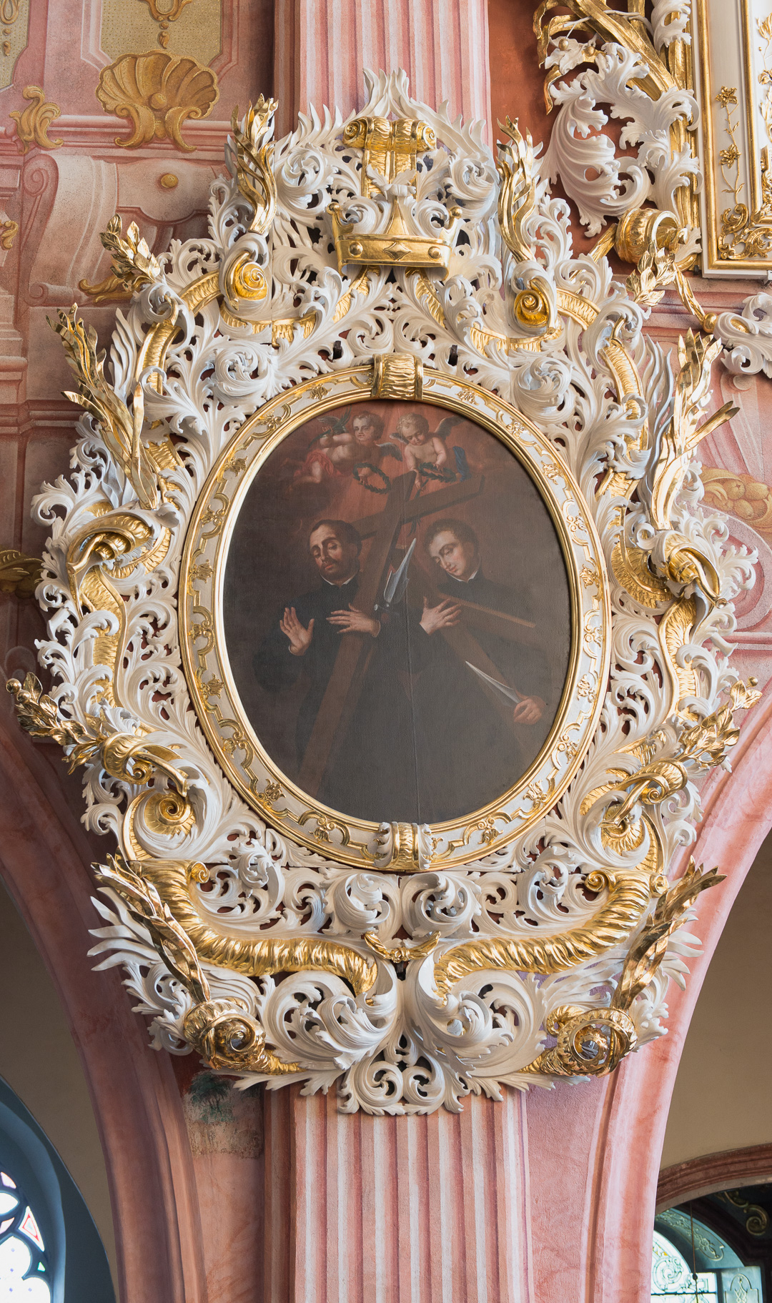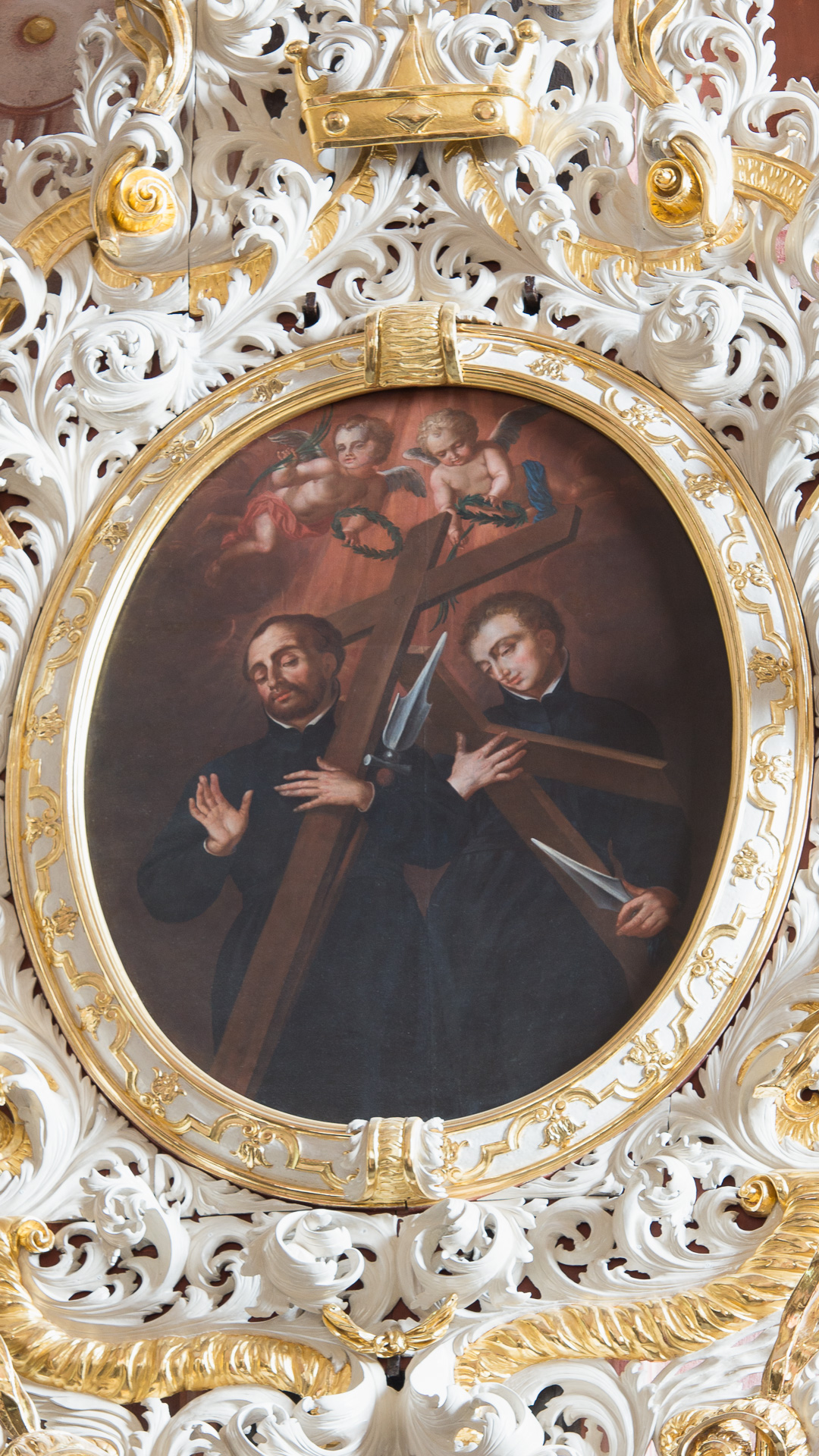 Опис: Овальне зображення містить зображення двох японських єзуїтів, мучеників, зображених із знаряддями тортур. Ідентифікація фігури є гіпотетичною та базується на її віці, ймовірно, зліва (з боку глядача): св. Яків Кісай з бородою та св. Іоанн де Гото – перший на момент спільного мучеництва був набагато старшим. Тло коричневе, однорідне, освітлене лише вгорі, освітлене променями, з контуром хмар. Мученики стоять поруч, вони зображені фронтально, з колін вгору. У верхній частині обидві фігури трохи оживлені, що підкреслюється рухом рук і нахилом голів в праву (геральдично) сторону, дещо під іншим кутом. Святі по-різному тримають в руках масивні бронзові хрести та списи з дерев’яними древками та металевими, полірованими, сіро-блакитними лезами. Святий ліворуч тримає хрест лише лівою рукою, права піднята вільно, вертикально вгору, на висоті грудей. Обличчя обох фігур зображені строго реалістично, але вони позбавлені будь-яких рис східноазіатської фізіономії. Чоловік ліворуч від поля зображення старший і зріліший, його овальне обличчя обрамлене короткою щетиною, а молодий чоловік має більш тонкі, трохи загострені риси обличчя; коротке волосся обох чоловіків і щетина святого ліворуч коричневі. В обох святих опущені повіки; їх колір обличчя блідо-рожевий. Одягнені в єзуїтські габіти, чорні, з відкритими комірами, що відкривають краї комірів білих нижніх сорочок; рукава габітів довгі та вузькі, на кінцях деяких помітних подолів білої білизни. Над головами обох святих, на освітленій частині тла, зображено два літаючих ангели, вкриті рожево-блакитними драпіровками на поясі, зі світлим волоссям, які тримають у руках вінки та пальми. Частково ажурна рамка. У загальному обрисі овал, злегка витягнутий по вертикальній осі. У верхній частині оздоблення рами дещо вигадливіше, має характер накінчення, у центрі якого видно вінець. Каркас внизу вирізаний прямо. Виготовлений із симетричних багатошарових переплетень джгутика аканта білого кольору шліфованого ґрунту, з різким укладанням (але ще не в’яне). Описані переплетення збагачені мотивами, повністю або частково золотими: профільовані смуги (деякі в композиціях, характерних для так званих регентських орнаментів, із колокольчиками), ділянки зібраної стрічки різної ширини, переважно кручені (з волютними закінченнями), самостійні волюти. , пальмове листя, лаврові гілки та ріг достатку. Верх рамки підкреслено подвійною гофрованою стрічкою, яка утворює волюту.